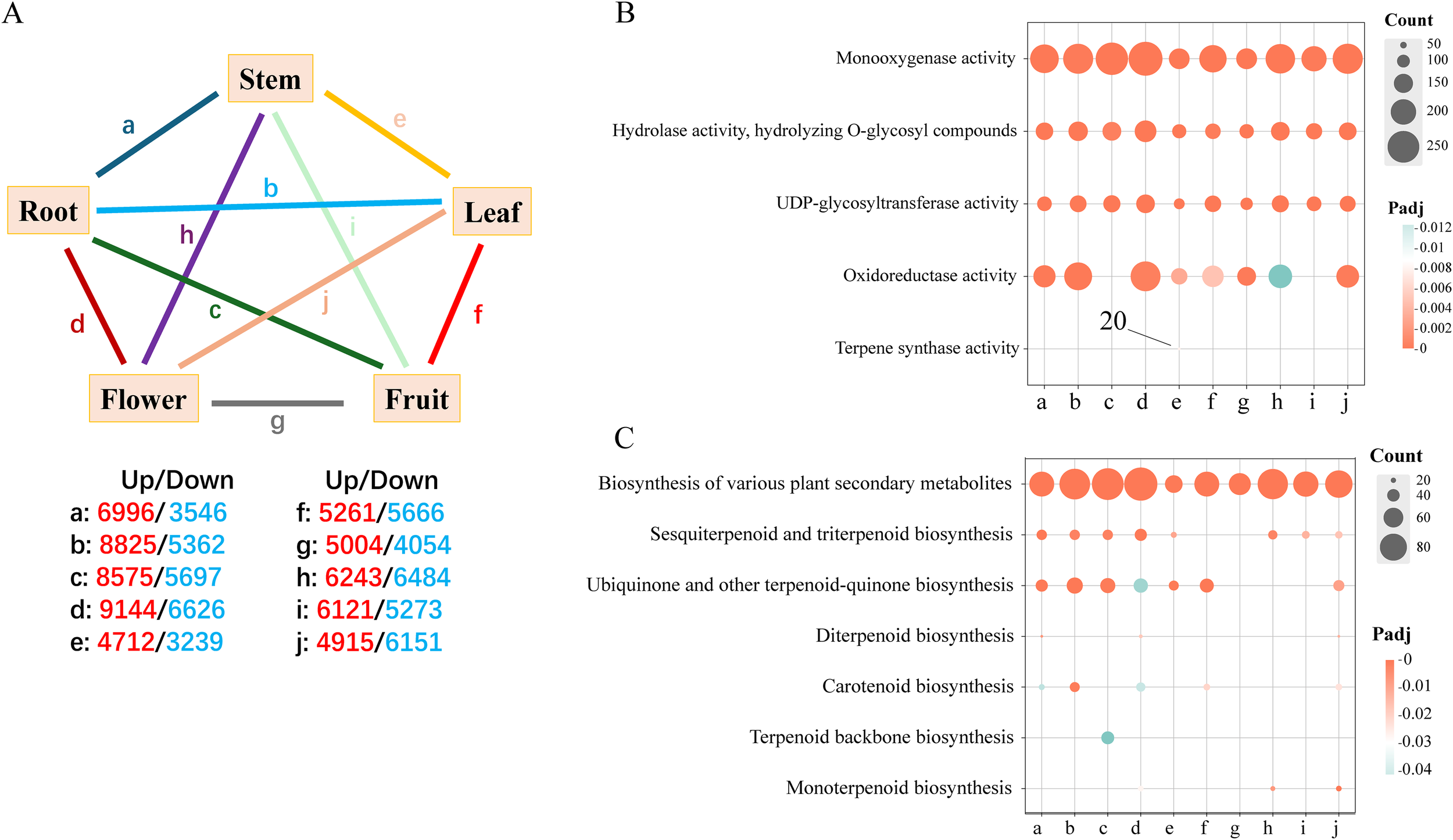 GO and KEGG enrichment analysis. (A) DEG group comparison of pentagram charts. This section covers the analysis of pairwise comparative combinations of 5 tissues: a: Root and Stem; b: Root and Leaf; c: Fruit and Root; d: Flower and Root; e: Stem and Leaf; f: Leaf and Fruit; g: Flowers and Fruit; h: Flower and Stem; i: Stem and Fruit; j: Flower and Leaf. The red and blue numbers indicate the number of DEGs up-regulated and down-regulated, respectively. (B, C) Bubble maps were used for GO and KEGG enrichment analysis of up-regulated genes.