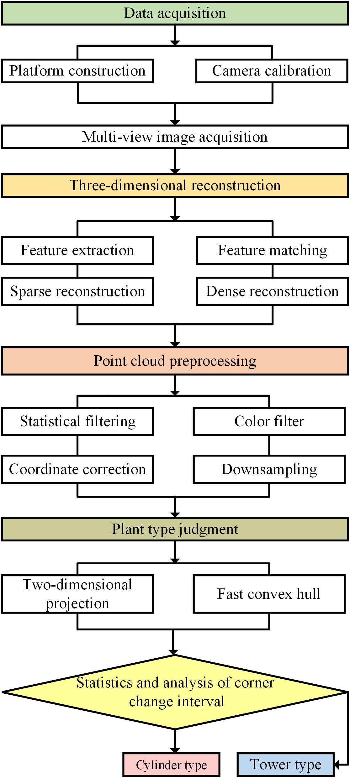 Cotton is a valuable economic crop and the main raw material of the global textile Industry (Dai et al., 2017; Li et al., 2021). In 2023, the cotton planting area in Xinjiang was 2369.3 khm2, with a total output of 5.112 million tons, accounting for 91% of the national total output. Plant type is a key factor affecting cotton yield, early maturity and mechanized harvesting, and is an indispensable part of crop breeding. The ideal plant type is helpful to increase planting density, improve photosynthetic efficiency and reduce yield loss during mechanized harvesting (Wang et al., 2024). Cotton plant type is mainly divided into cylinder type and tower type (Du and Zhou, 2005). At present, cotton plant type is mainly judged by visual observation, lacking quantitative evaluation system and standard. It is urgent to construct a rapid, accurate and undamaged cotton plant type analysis and identification method.