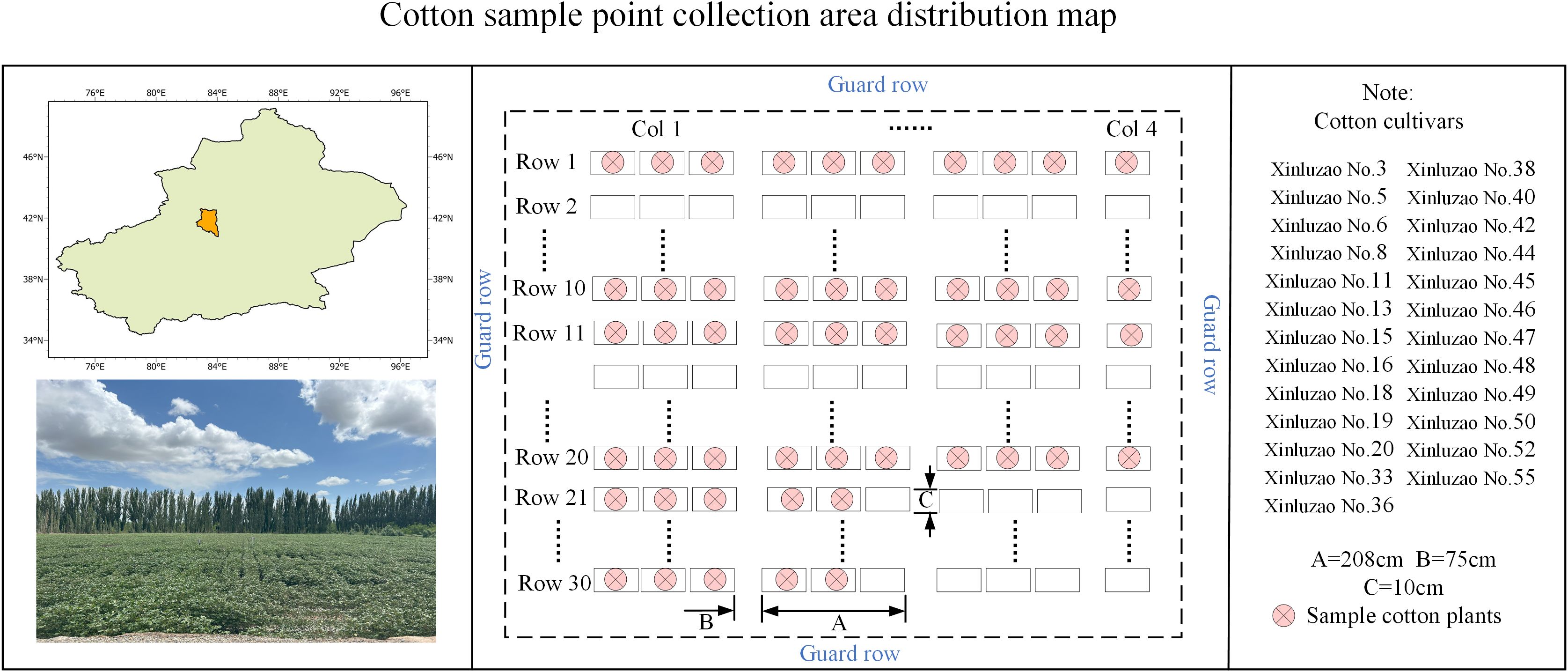 Taking cotton as the experimental object of this study, from April to November 2024, data collection was carried out at the cotton base of Kuche Modern Agricultural Science and Technology Innovation Center. A total of 25 varieties were selected, 2 plants for each variety, and a total of 50 cotton plant samples were selected. Among them, 20 cotton plants were used as validation set. The field distribution position is shown in Figure 2, and the cotton plants were moved to the flowerpot and moved indoors.