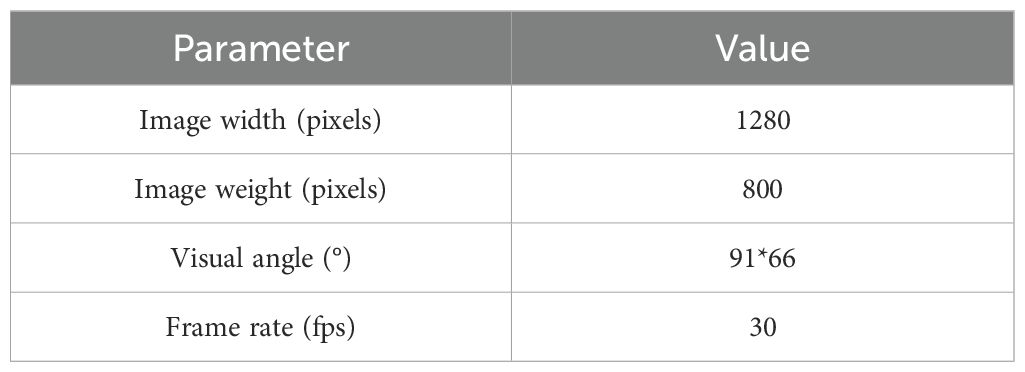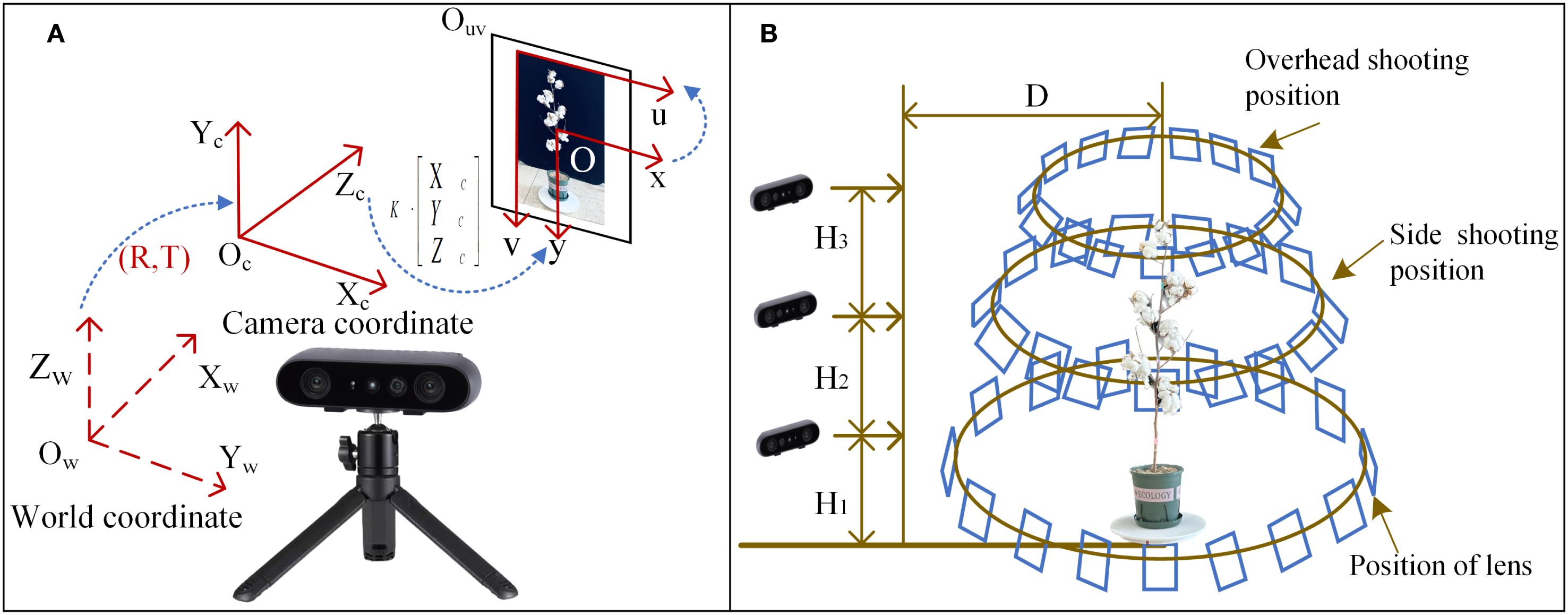 In order to obtain clear and high-quality data, an indoor image acquisition platform composed of a tripod, a binocular structured light camera, a black screen, a 39 cm-diameter electric turntable and a computer is built. In this study, ORBBEC Gemini 2 is used for data shooting. The intrinsic parameters of the camera are shown in Table 1. The depth range of the camera is 0.2 m-5 m. This camera uses a depth sensing system, which uses active infrared (IR) stereo vision and inertial measurement unit (IMU). The system uses structured light technology to work through a pattern projector to create the difference between the stereo images captured by two infrared cameras. Accurate direction parameters are provided by 6-axis IMU. The Lenovo computer is used for later data processing and analysis. The computer is configured as: Windows 64-bit operating system, 32G running memory, inter (R) Core (TM) i7-14700HX CPU, RTX 4060 graphics card. The principle of coordinate transformation between cameras is shown in Figure 3A. The camera calibration process is as follows: