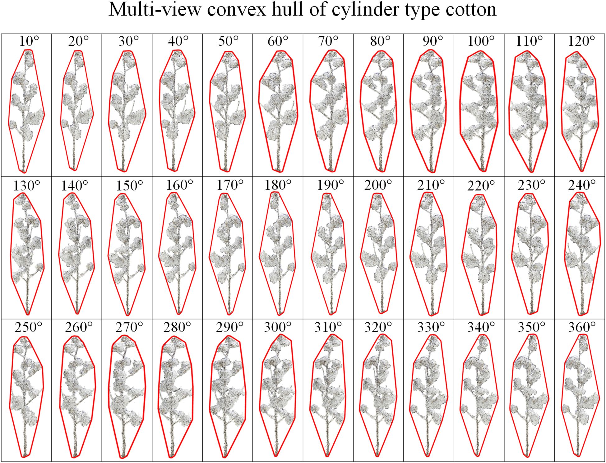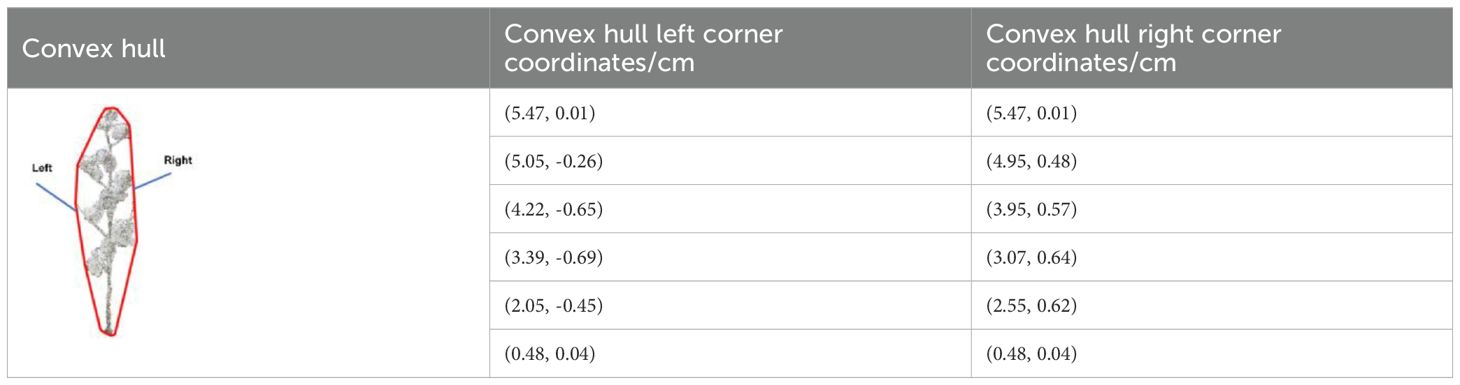 A convex hull is the smallest convex polygon or polyhedron that can contain all given points, which can determine the minimum enclosing shape of the point set (Zhou et al., 2024). The fast convex hull algorithm can construct the minimum bounding shape of the two-dimensional point set of cotton. By analyzing the minimum bounding shape of cotton, the geometric structure information of cotton can be obtained.