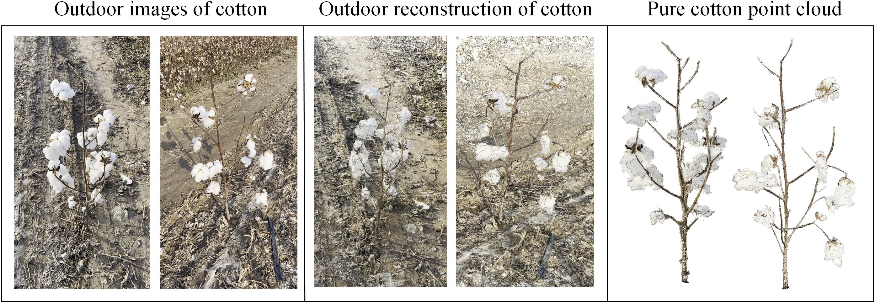 In order to evaluate the reconstruction quality under different lighting conditions, this manuscript tests the 3D reconstruction algorithm for different background complexity and different environments (indoor and outdoor). In this manuscript, the data of 10 cotton boll opening periods were collected at Shihezi planting base (outdoor) from October 20 to October 23, 2024 at 19: 00 pm. The collection environment was sunny and the wind level was small and there was no strong light. As shown in Figure 9, outdoor data include natural light, drip irrigation tape, plastic film and other complex backgrounds, and three-dimensional reconstruction and reconstruction accuracy verification are carried out. On October 24, 2024, 10 cotton plants were moved into the room, and three-dimensional reconstruction was carried out under a simple indoor background. Regression analysis was performed on the reconstructed cotton plant height and plant width, The RMSE of indoor plant height and plant width after reconstruction were 0.372 cm and 0.387 cm, respectively, and the RMSE of outdoor plant height and plant width were 0.391 cm and 0.402 cm, respectively. The RMSE of plant height and plant width in outdoor were slightly higher than those in indoor by 0.019 cm and 0.015 cm, respectively. It shows that the SFM reconstruction algorithm has good robustness in different environments.