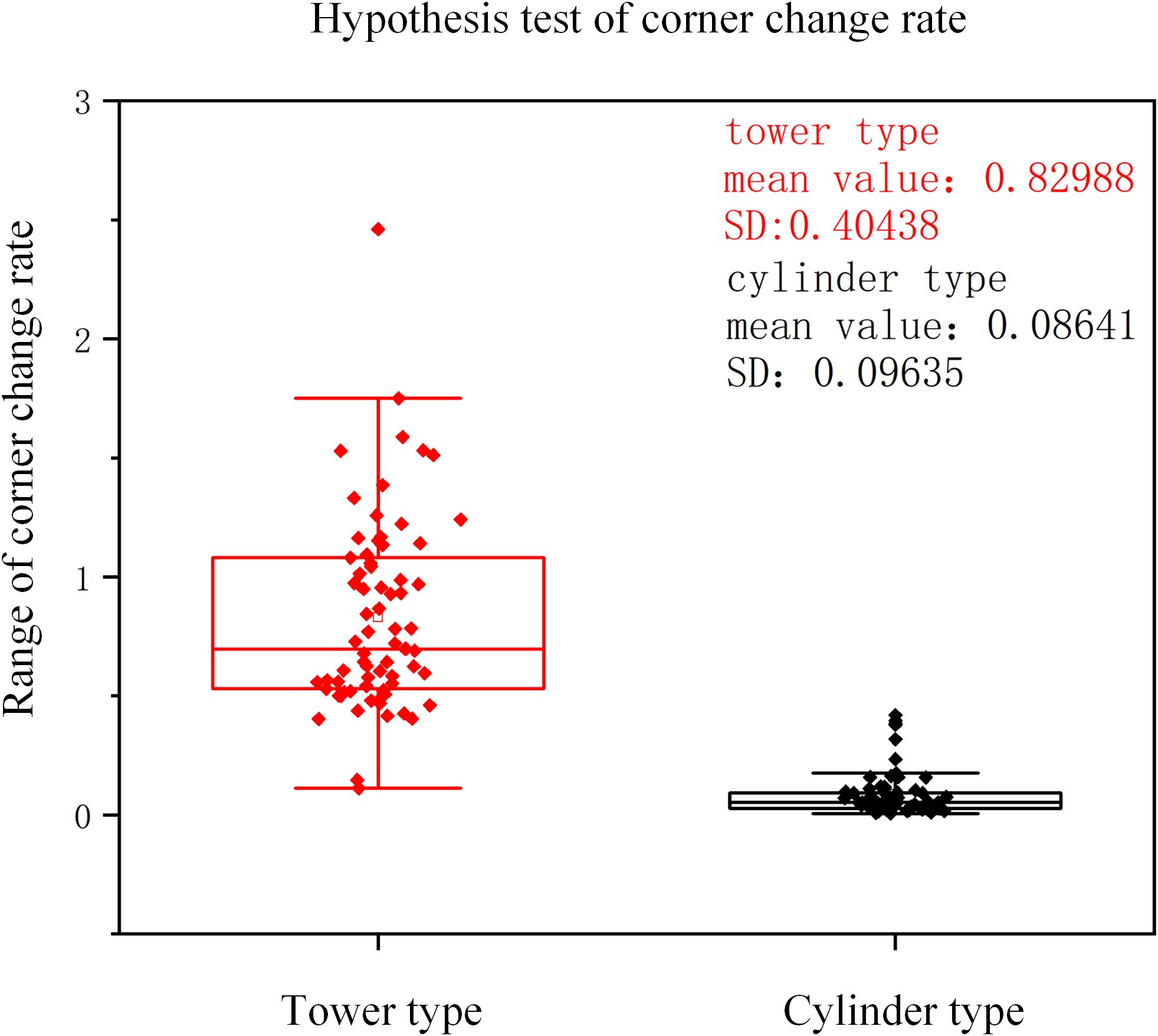 After three-dimensional reconstruction of cotton plants, 1800 two-dimensional images were obtained by two-dimensional projection every 10° interval on all data sets, and the change rate of corner points was calculated respectively. The corner change rate of all cylinder types was calculated, the confidence interval was (0.04687, 0.19357), indicating that most of the sample data were in (0.04687, 0.19357) at 95% confidence level. The corner change rate of all tower types was calculated, and the confidence interval was (0.39987,1.46357), indicating that most of the sample data were (0.39987,1.46357) at 95% confidence. It is basically consistent with the conclusion of this study that the range of cylinder type is 0-0.2, and the range of tower type is 0.4-1.5. The hypothesis test is carried out on the corner change rate data of two different plant types of cotton. The results are shown in Figure 11. The sample mean and standard deviation of the tower type were 0.82988 and 0.40438. The sample mean and standard deviation of cylinder type were 0.08641 and 0.09635, respectively. There were significant differences in sample mean and standard deviation between tower type and cylinder type. P = 1.91503×10–29 is far less than the commonly used significance level of 0.05, indicating that there is a significant statistical difference between the corner change rate of the tower type and the cylinder type.