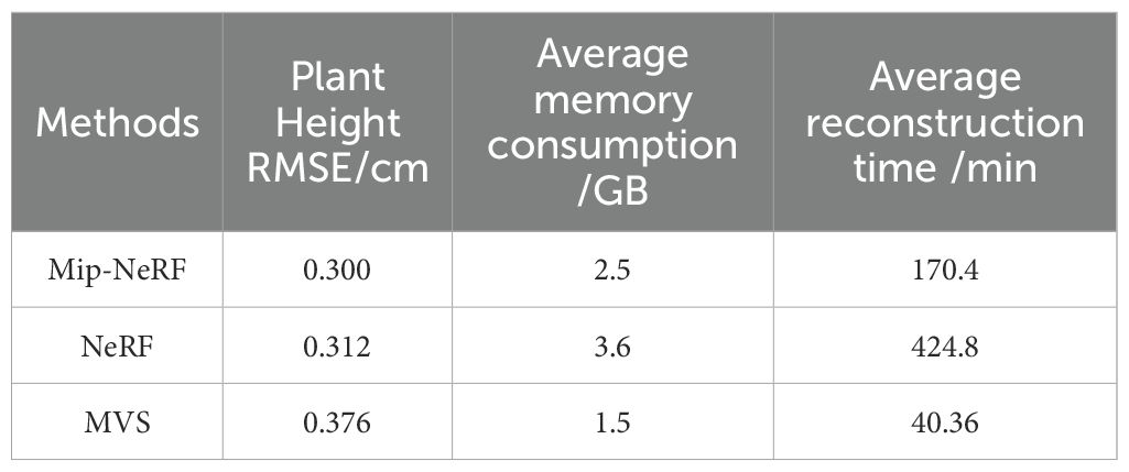 In order to verify the effectiveness of MVS in cotton plant type reconstruction, We used MVS, NeRF and Mip-NeRF methods to reconstruct cotton plants on the same data set. As shown in Table 4. Although Mip-NeRF and NeRF methods were slightly higher than MVS in plant height RMSE by 0.076 cm and 0.064 cm, respectively, these two methods significantly increased computer memory consumption and reconstruction time. The MVS method meets the requirements of plant type for plant structure clarity. Considering the reconstruction accuracy and memory consumption, this manuscript uses MVS for three-dimensional reconstruction.