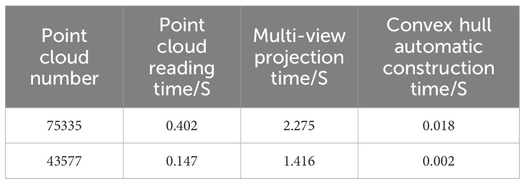 The point cloud data reading, automatic acquisition of multi-view two-dimensional projection and rapid construction of convex hull were carried out on the three-dimensional model of cotton plant after down-sampling. The results are shown in Table 5. When the maximum number of point clouds is 75335, the point cloud reading time, multi-view projection time and convex hull construction time are 0.402 S, 2.275 S and 0.018 S, respectively, indicating that the algorithm in this study runs faster.