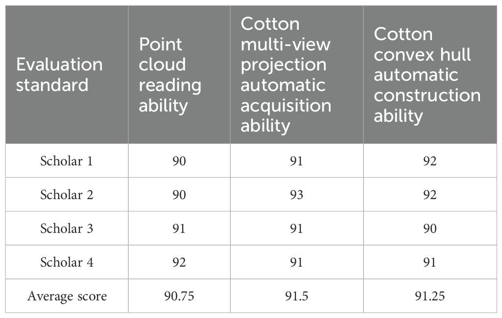 Four cotton agronomists evaluated the proposed plant type identification method from the point cloud reading rate, the automatic acquisition ability of cotton multi-view projection and the automatic construction ability of cotton convex hull in Table 6 respectively. The average evaluation scores were all above 90, indicating the rationality and innovation of the cotton plant type identification method proposed in this study. Four agronomic experts judged the cotton test set for three times, and used Kappa test to test the consistency of the expert classification results. The Kappa coefficient was calculated to be 0.8655, which was between 0.75-1, indicating that the expert classification results had good reliability.