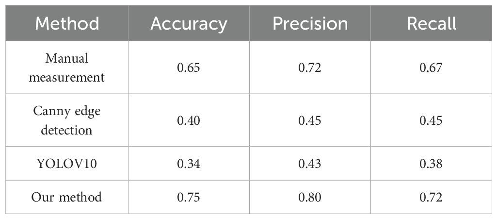 In this study, the data set is increased to 50 cotton plants, of which 20 cotton plants are used as the validation set. The manual measurement method, Canny edge detection, YOLOV10 and the proposed method are compared and analyzed respectively.