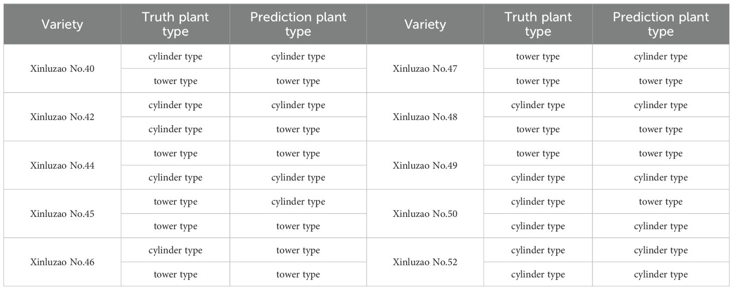 Based on the cotton plant type classification described in the ‘Cotton Germplasm Resources Description Specification and Data Standards’ standard and the agronomic knowledge of experts, the cotton plant type were judged as the real plant type label. According to the plant type measurement method specified in the standard of ‘Technical Specification for Identification and Evaluation of Crop Germplasm Resources Cotton’, the length of upper, middle and lower fruiting branches of cotton plants was measured by manual measurement method. If the length of the upper, middle and lower fruit branches of cotton is similar, it is a cylinder type. If the lower fruit branch is long and the upper branch is gradually shortened, it is a tower type. Then the cotton plant type of the verification set is obtained. On the same verification set, the plant type obtained by the cotton plant type judgment method proposed in this study is compared with the results of manual measurement.