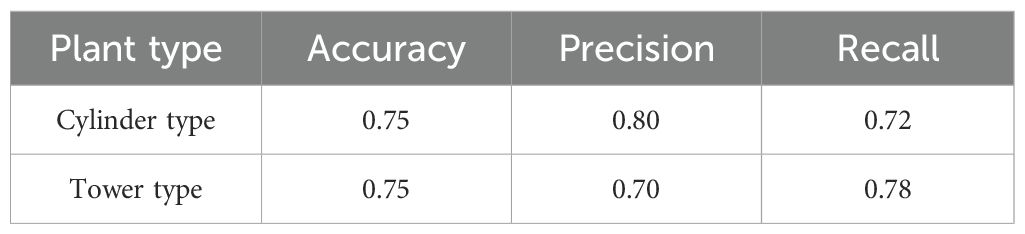 The cotton plant type data were analyzed, and the results are shown in Table 9. The accuracy of cotton plant type Accuracy is 0.75, indicating that the model performs well in the overall classification task. Further analysis of the performance of each category, the precision of the cylinder type and the recall rate of the tower type reached 0.80 and 0.78, respectively, indicating that the model has high reliability in identifying the tower type and the cylinder type.