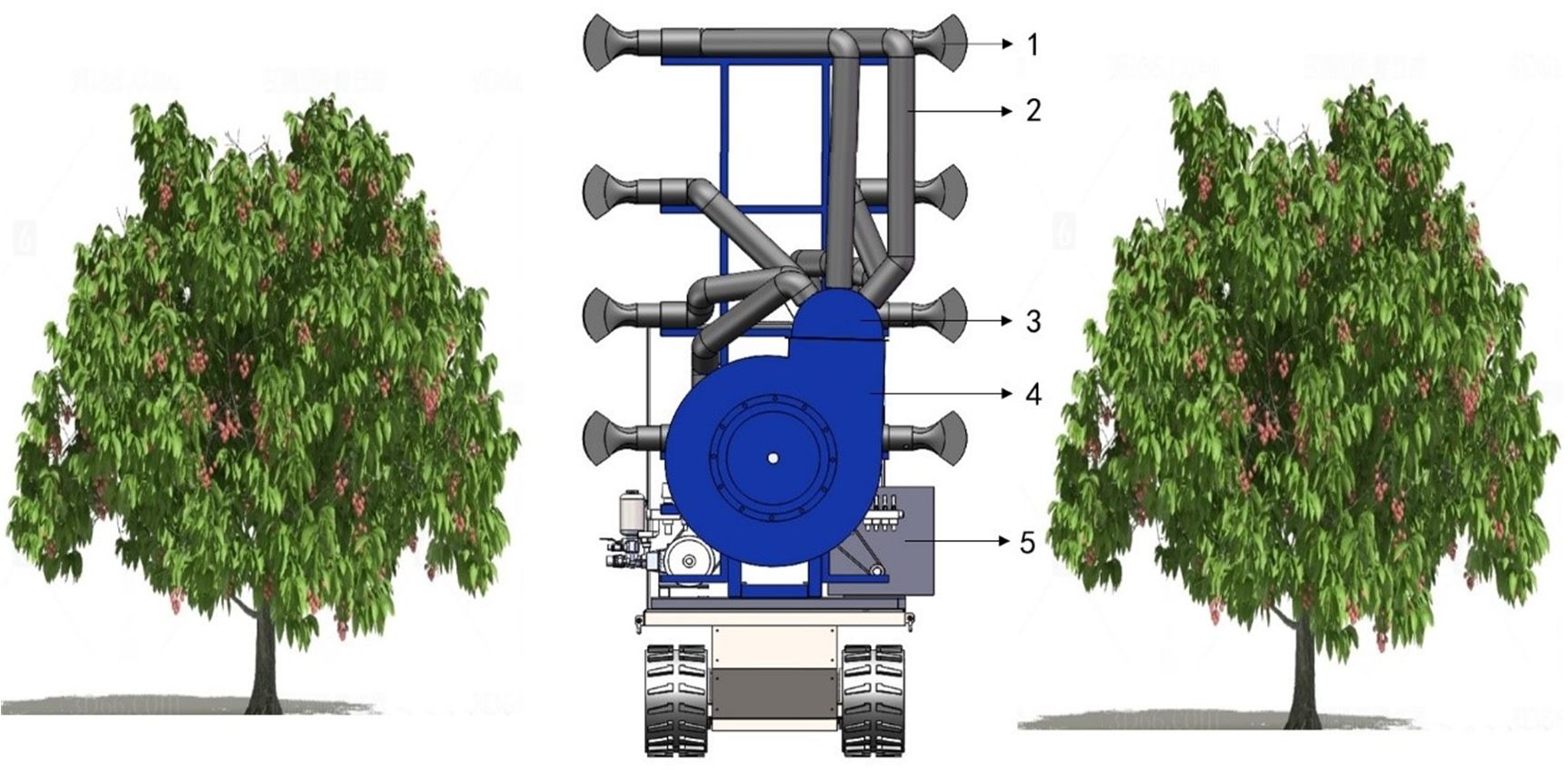 Pests and diseases represent a critical challenge in fruit cultivation, with their prevention and control being a key component of effective orchard management (Ma et al., 2021; Chen et al., 2023; Xue et al., 2023). Traditionally, chemical control methods have been widely employed due to their effectiveness in managing pests and diseases, as well as their ease of application. However, chemical control methods also present several significant challenges. Chemical residues may persist, leading to environmental pollution, food safety concerns, and potential risks to human health. According to data from the FAOSTAT pesticide use database, global agricultural pesticide consumption reached 3.7 million tons in 2022, marking a 4% increase from 2021 and a 13% rise over the past decade. However, a significant disparity remains in pesticide utilization rates among the world’s leading pesticide-consuming countries. The air-assisted sprayer is one of the most commonly used pieces of equipment in contemporary orchard plant protection systems. Specifically, multi-duct air-assisted spraying technology allows simultaneous application through multiple air ducts. The high-speed airflow generated by the fan causes the leaves to flip, enabling droplets to penetrate the branches and canopy interior, thus enhancing spraying efficiency, uniformity, and overall pesticide application effectiveness (Gu et al., 2014; Zhai et al., 2021). However, the operational effectiveness of the sprayer is constrained by various factors in practical application scenarios (Jiang et al., 2020). Therefore, conducting research on the sprayer using simulation method is crucial (Li et al., 2021). Computational Fluid Dynamics (CFD), the product of integrating computer science and fluid mechanics, has become a vital tool in engineering design and optimization. Simultaneously, CFD has emerged as one of the primary methods for both domestic and international scholars to study the motion characteristics and distribution patterns of the external flow field in orchard air-conveying sprayers (Zhai et al., 2021).