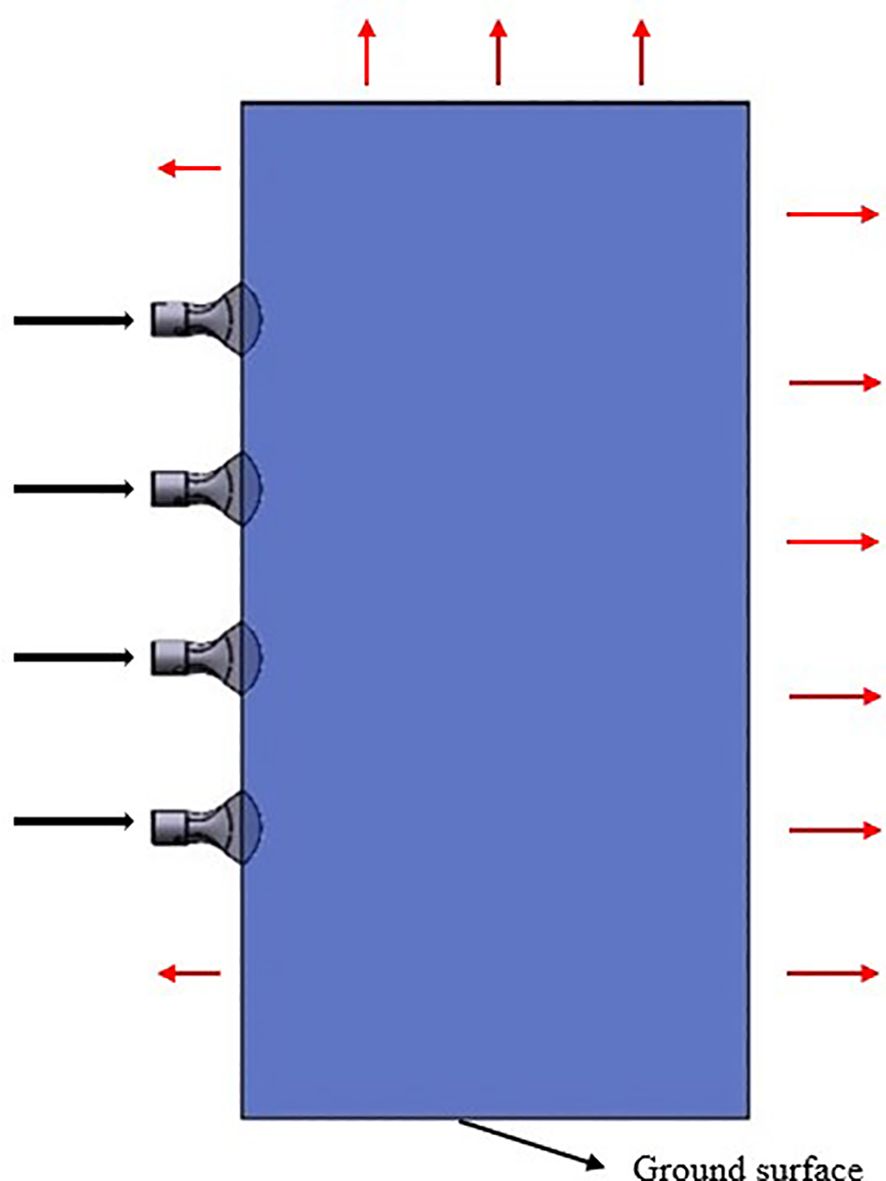 This study aims to investigate the movement characteristics of droplets in the external flow field of a multi-duct sprayer influenced by the airflow field, with the goal of offering insights for its subsequent optimization. Based on the actual working conditions, a geometric model of the outflow field of multiple air ducts was created in SolidWorks software to enhance simulation efficiency and simplify the working area. In this model, the geometry is simplified into a rectangular domain measuring 1500 mm × 400 mm × 3500 mm, which includes four air outlets and a fluid computational domain, as illustrated in Figure 3. In the figure, the black arrow represents the entrance of the airflow into the computational domain, and the red arrow represents that the airflow can flow out from here. The area below the computational domain is regarded as the ground surface, and the airflow cannot escape from this area.