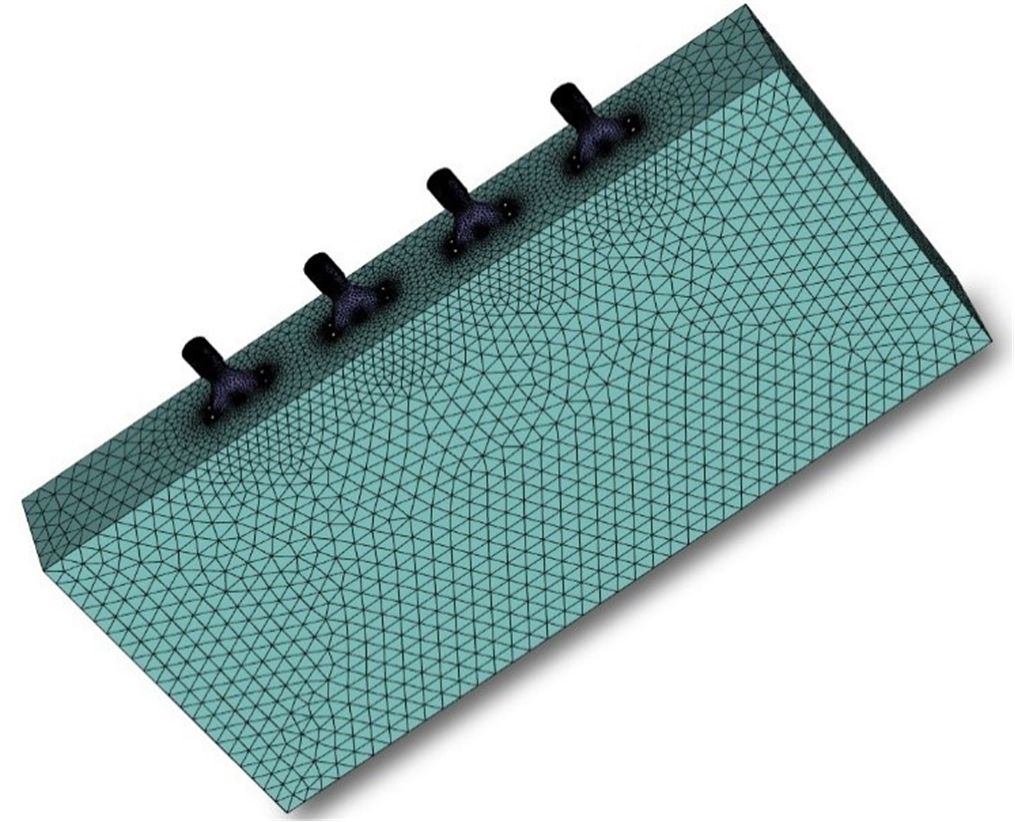 The established model is imported into SpaceClaim software, where the fluid computational domain is extracted, and boundary conditions are defined. The bottom of the model is considered as the ground surface. In practical applications, airflow in contact with the ground surface will not escape. Consequently, the bottom boundary is defined as a no-slip wall. Additionally, the wall at the end of the computational domain is defined as a solid boundary to facilitate subsequent analysis of the liquid film thickness. The remaining surfaces of the model, excluding the four air outlets, are considered as surfaces where airflow can escape, and are defined as pressure outlets. Subsequently, the outer surfaces of the four air outlets are defined as walls. Finally, the fluid computational domain is extracted, and the defined model is imported into Ansys Fluent for further processing (Zhang et al., 2022).