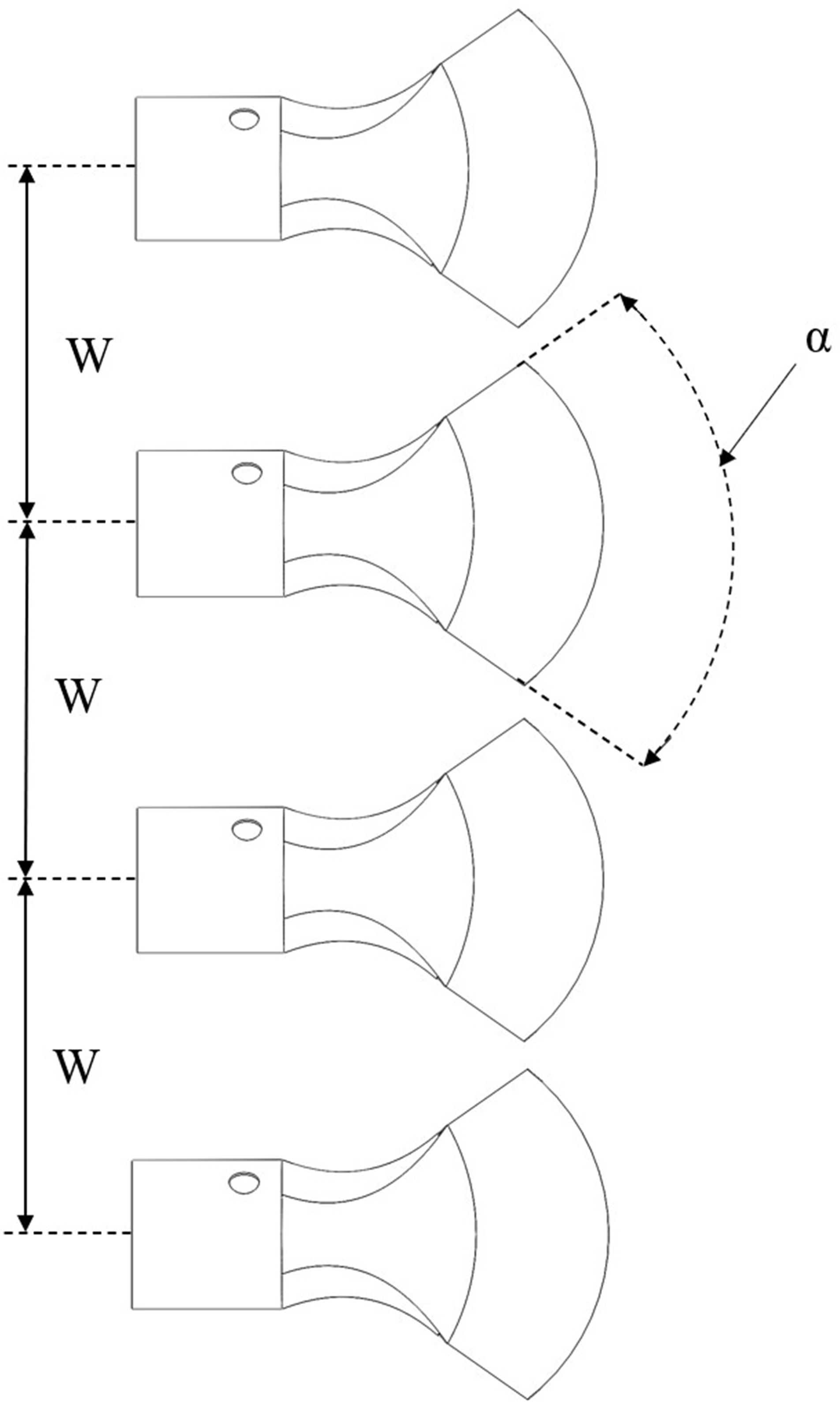 The degree of opening of the air outlet and its interval configuration significantly influences the distribution of the multi-duct spray, as illustrated in Figure 7. In the figure, α denotes the degree of opening of the air outlet, and W represents the interval between the air outlets. This study investigates the effect of varying test levels of air outlet opening degrees and interval on the effective working height of the airflow field, using CFD simulations. However, the simulation content related to the spray was not covered, so the DPM simulation model was not included in the simulation process of this section. Furthermore, monitoring was implemented at the boundary of the computational domain to assess the uniformity of the velocity distribution within the airflow field and to investigate how the air outlet opening degree and interval affect this uniformity. This test provides valuable data and insights that can support the future optimization of the multi-duct sprayer for profiling spray operations.