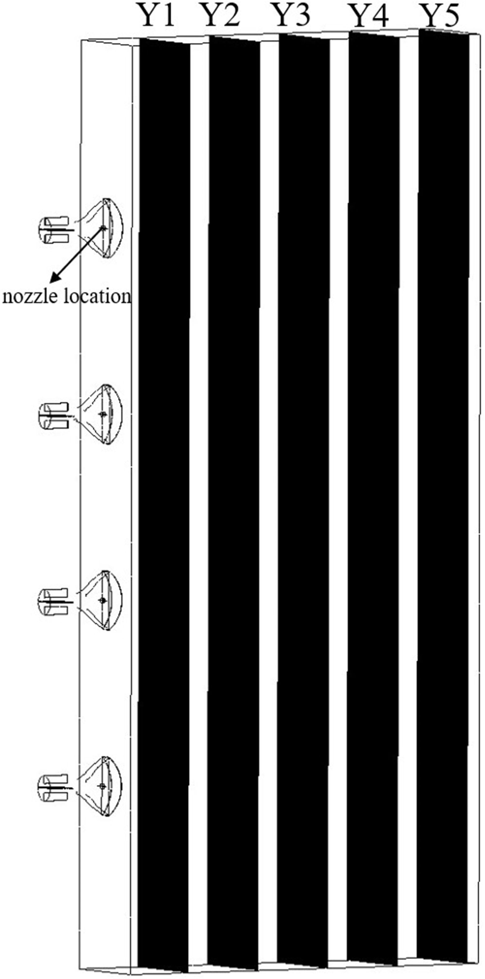 Monitoring planes were set at distances of 0.3 m, 0.6 m, 0.9 m, 1.2 m, and 1.5 m from the nozzle location, denoted as Y1, Y2, Y3, Y4, and Y5, respectively, as illustrated in Figure 8. Subsequently, the temporal variations in droplet size on the monitoring surfaces are analyzed to derive the governing principles of droplet size distribution within the airflow field, followed by the atomization behavior. Finally, within the DPM model, the droplet collision, breakup, and merging models are activated, and the species transport equation is concurrently enabled for computational resolution.