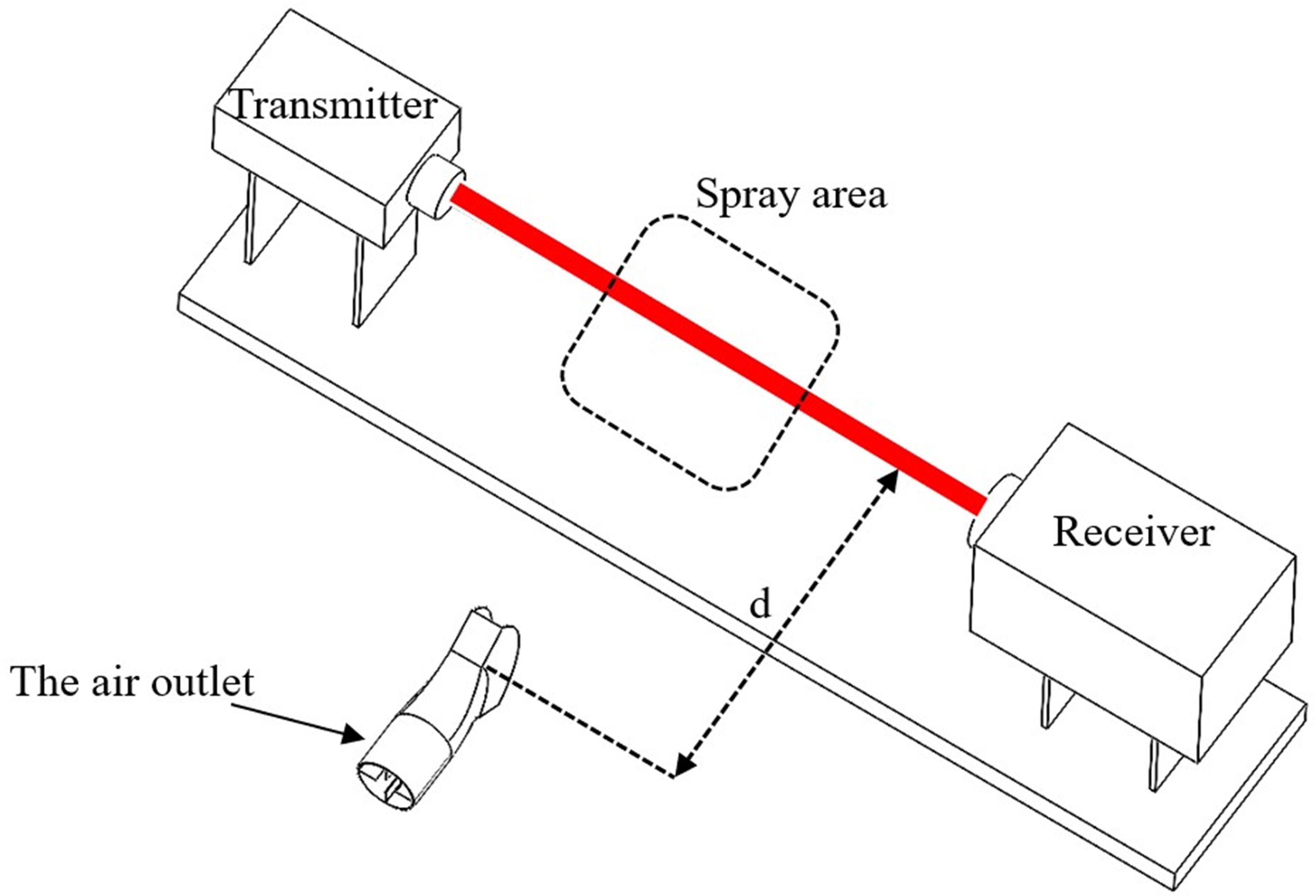 Due to the substantial dimensions of the multi-duct sprayer developed in this study, it is not feasible to assess the entire spray system. Consequently, this test was limited to testing a single duct of the multi-duct sprayer. A flat fan atomizer with a 70° spray angle and a 0.6 mm orifice width was selected for this test. The flow rate was set to 0.03 kg/s. Simultaneously, an air outlet with a 70° opening angle was selected. The rotational speed of the centrifugal fan was calibrated to 961.7 r/min, the rated speed of the fan, corresponding to an inlet air velocity of 45 m/s at the air outlet. Throughout the test, the laser particle size analyzer was positioned at a distance d from the outlet, with d taking values of 0.3 m, 0.6 m, 0.9 m, 1.2 m, and 1.5 m for five test groups. Each test group was repeated three times to record the measured droplet particle sizes. The particle size is calculated using the volume mean diameter (VMD) of the measurement values. The average of the droplet particle size measurements was then calculated as the test value. The droplet particle size measurement test schematic diagram is shown in Figure 9.