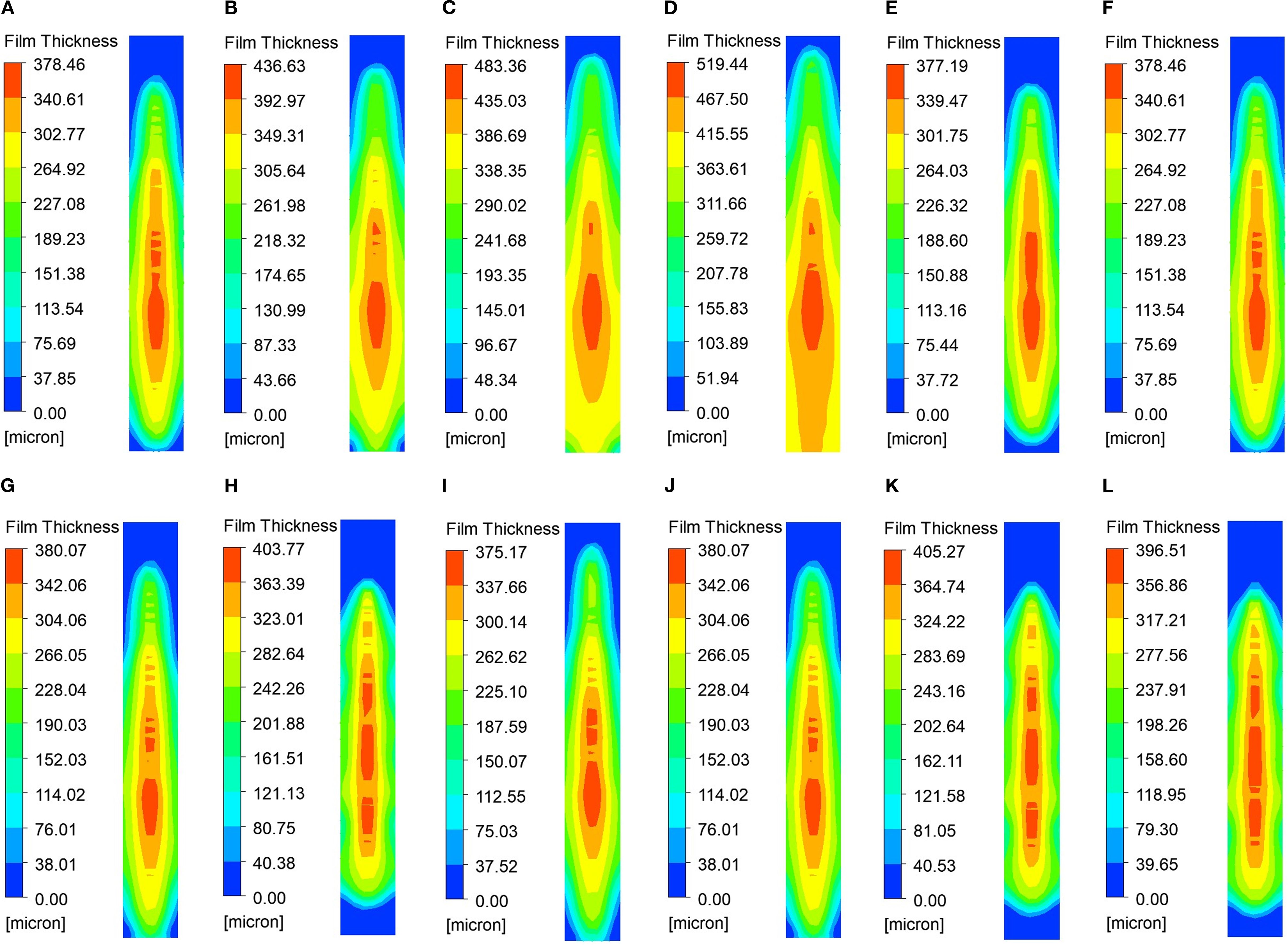 Figure 10. Contours of liquid film thickness for the considered cases: (A) 0.03,60,0.6; (B) 0.04,60,0.6; (C) 0.05,60,0.6; (D) 0.06,60,0.6; (E) 0.03,50,0.6; (F) 0.03,60,0.6; (G) 0.03,70,0.6; (H) 0.03,80,0.6; (I) 0.03,70,0.4; (J) 0.03,70,0.6; (K) 0.03,70,0.8; (L) 0.03,70,1.0.
