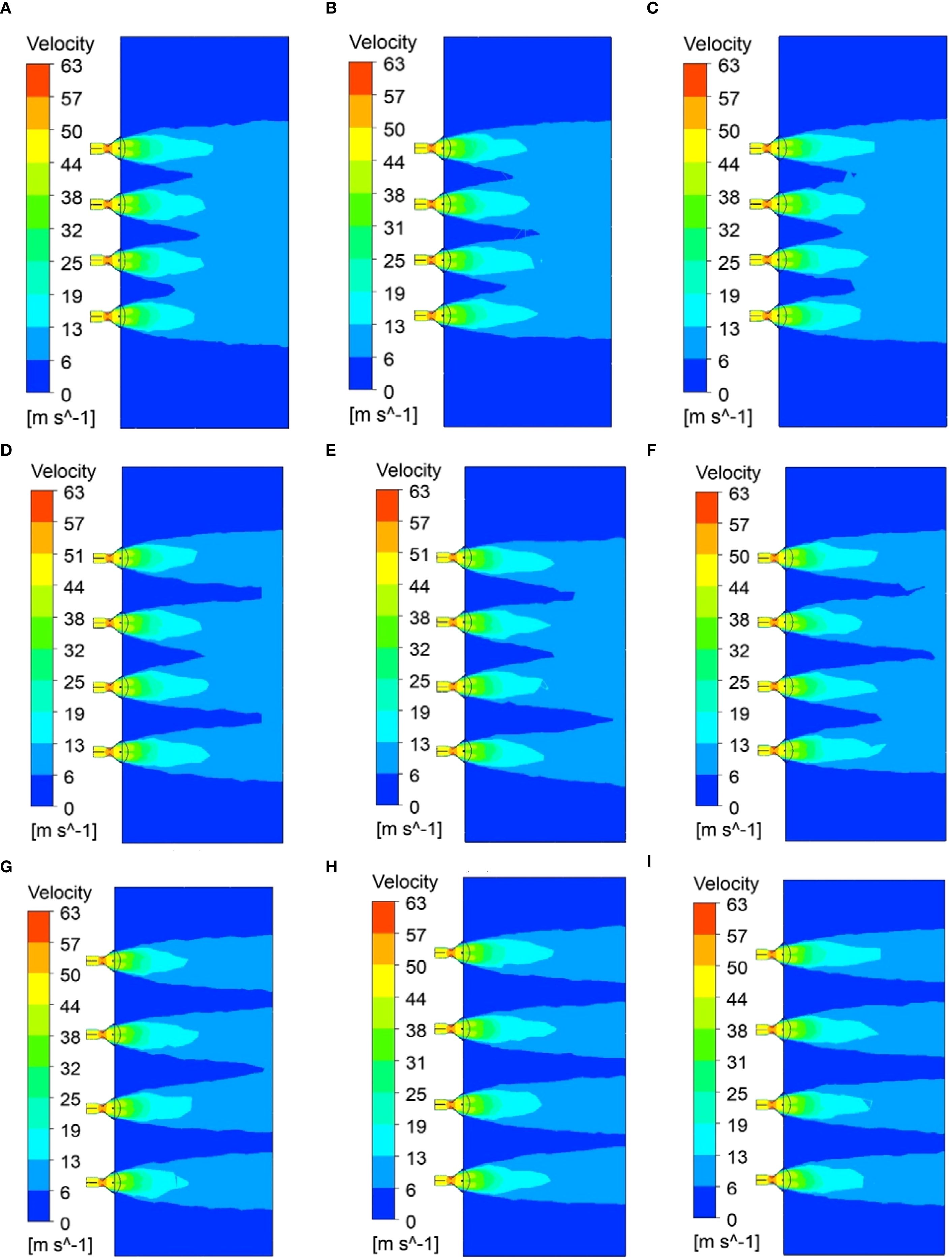 The simulation results are summarized in Table 6, while the results for each test level are presented in Figures 11A–I. A separate analysis of groups “A, B, C”, “D, E, F”, and “G, H, I” shows that when the air outlet opening increases from 70° to 80°, the effective working height of the airflow field increases by 0.2 m. However, when the air outlet opening increases from 80° to 90°, the effective working height of the airflow field increases by 0.1 m. Separate analysis of groups “A, D, G”, “B, E, H”, and “C, F, I” shows that when the air outlet interval increases by 100mm, the effective operating height of the airflow field increases by 0.3 m. Additionally, as illustrated in Table 6, when the outlet opening degree and interval are increased, the uniformity index of the airflow velocity distribution at the domain’s end exhibits a downward trend. This occurs because as the air outlet opening and interval increase, the interaction strength at each air outlet weakens, and the areas of high-speed airflow where local interactions occur decrease. However, it is important to note that when the interval between the air outlets is 700 mm, the airflow field prevents the airflow from each air outlet from converging, which may influence the transport and deposition of the droplets.