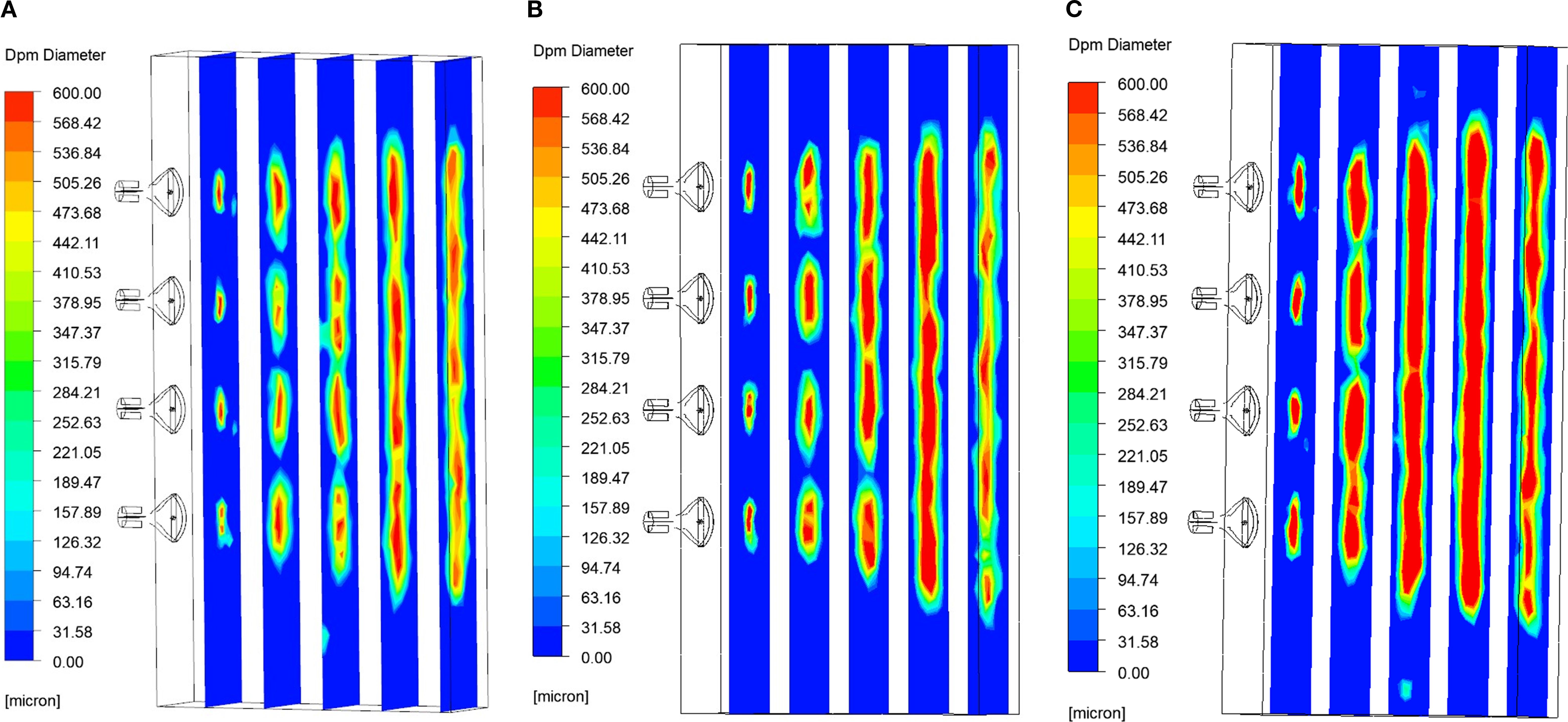 Figures 12A–C illustrates the contours of the droplet size distribution as influenced by the airflow field at three different air velocity. Additionally, Figures 12A–C summarizes the average droplet size for each monitoring surface.