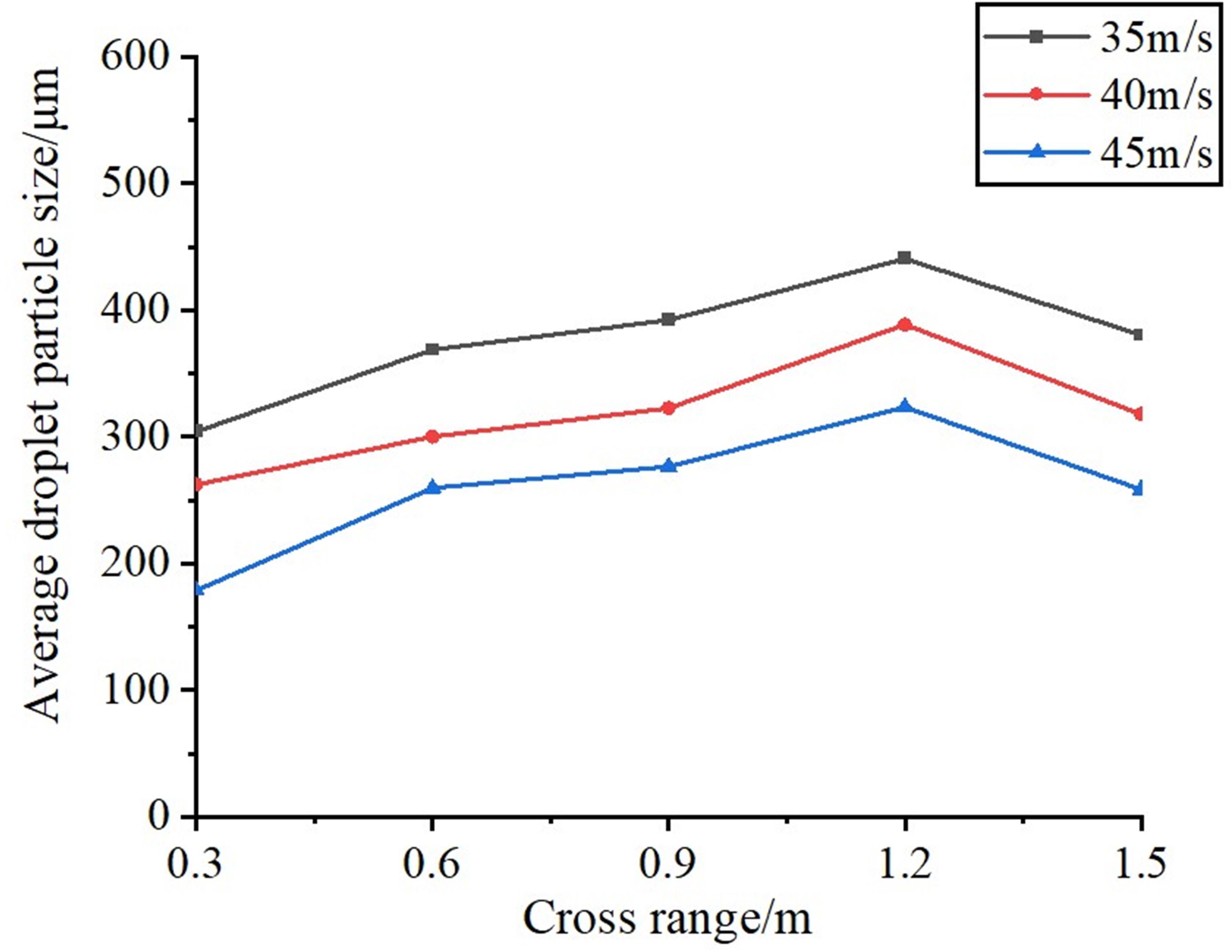 As shown in Figures 12A–C, 13, when the liquid is ejected from the nozzle, the initial atomization occurs as a result of the interaction between jet instability (Mu et al., 2020) and the airflow field, leading to a significant reduction in droplet size. Subsequently, the smaller droplets collide and coalesce in the airflow field due to their instability, continuing until they reach approximately 1.2 meters from the air outlet. Once the droplet size reaches a certain threshold and growth ceases, although the wind speed has attenuated to some extent, it still exerts sufficient shear force to induce a second atomization, resulting in a further reduction in droplet size, which enhances droplet deposition.