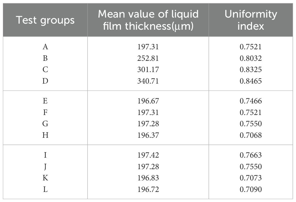 The simulation results are summarized in Table 4, Additionally, the simulation results for each group are depicted in Figures 10A–L. The figure indicates that the regions of highest concentration of liquid film thickness are primarily located in the middle and lower sections of the collection surface. This outcome is attributed to the consideration of gravitational effects on droplet movement in the simulation process described in this study (Chen et al., 2020). From the overall analysis of Table 4 and Figures 10A–L, it is evident that the flow rate has the most substantial effect on the mean liquid film thickness, whereas the spray angle and nozzle orifice width show no significant impact on the liquid film thickness but notably influence the uniformity index of the liquid film distribution.