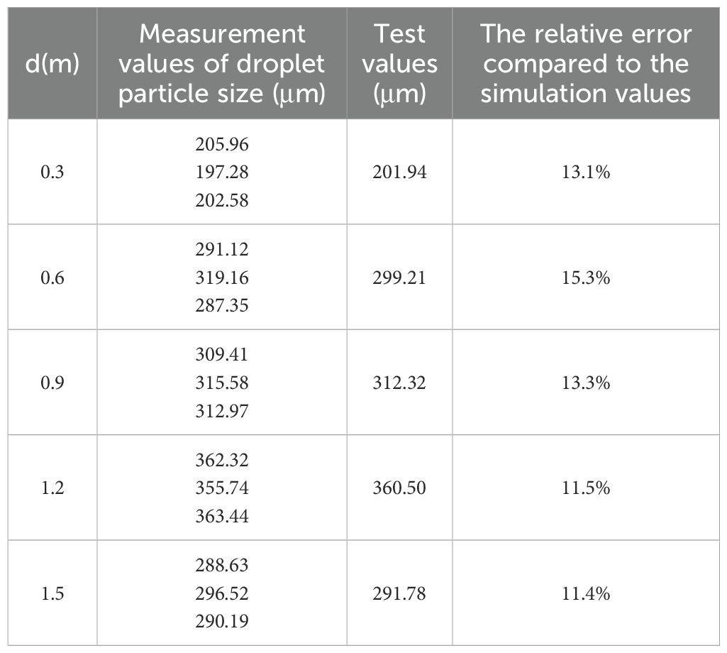 The results of the tests are summarized in Table 7. Analysis of Table 7 reveals that the test values of droplet particle size initially increase and then decrease as the d value increases, a trend that aligns with the simulation values shown in Figure 13. Concurrently, the average of the three measurement values in each test group was computed, and the relative error between these values and the simulation values was calculated. The relative errors between the test values and the simulation values across the five test groups ranged from 11.4% to 15.3%, all of which were below 16%, thereby confirming the reliability and applicability of the CFD simulation model established in this study.