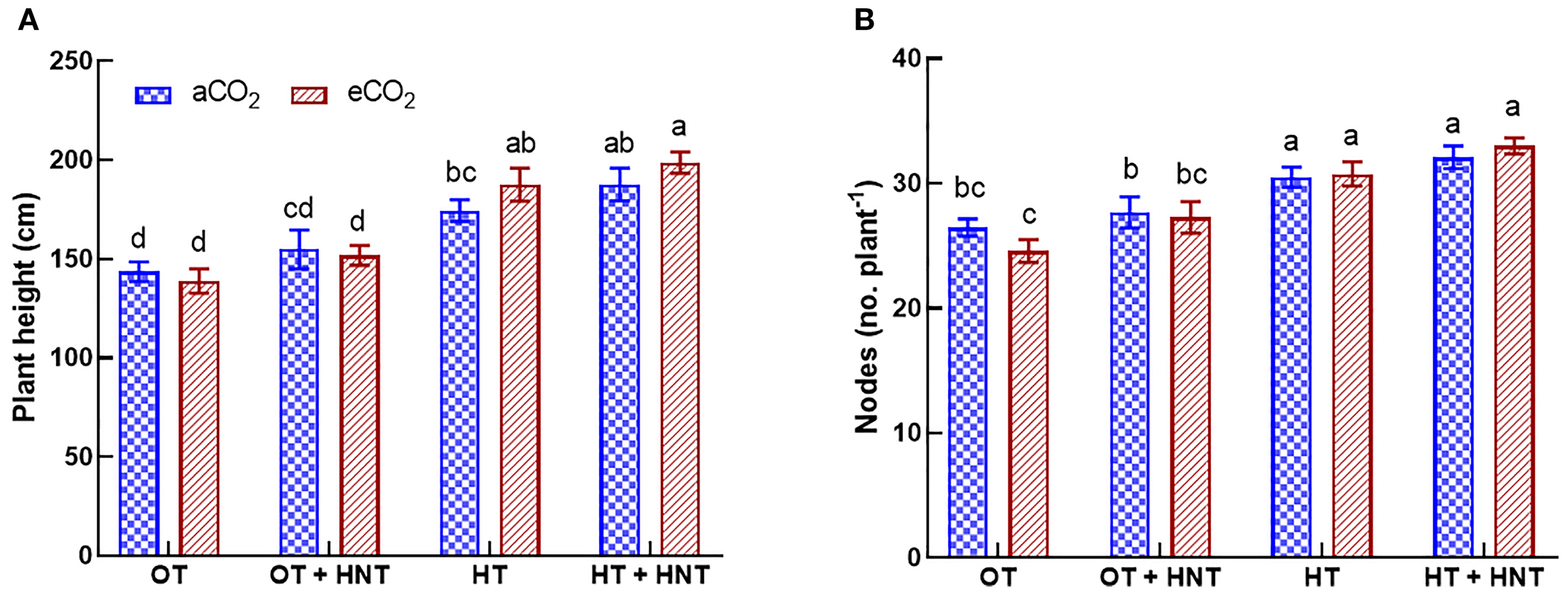 Day/Night air temperatures (OT: 33/21°C, OT+HNT: 33/24°C, HT: 36/24°C, HT+HNT: 36/28°C) and CO2 (aCO2: 425 ppm, eCO2: 725 ppm) effects on (A) plant height and (B) number of nodes (plant-1) during cotton boll development stage. The bars are the treatment mean ± SE of twelve replications. The letter above the bar indicates significance at p< 0.05. The treatments with the same letters are non-significant.