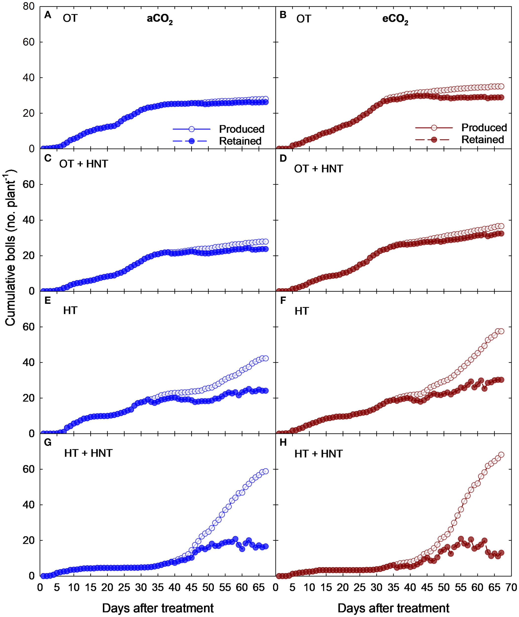 Cumulative number of boll production and retention (no. plant-1) at aCO2 (425 ppm) and eCO2 (725 ppm) concentrations under day/night temperatures of (A, B) OT (33/21°C), (C, D) OT + HNT (33/24°C), (E, F) HT (36/24°C), and (G, H) HT + HNT (36/28°C) in cotton. The X-axis indicates the days after treatment (0–68 days), which is equivalent to 60–128 days after sowing. The experiment consisted of 12 plants per square meter.