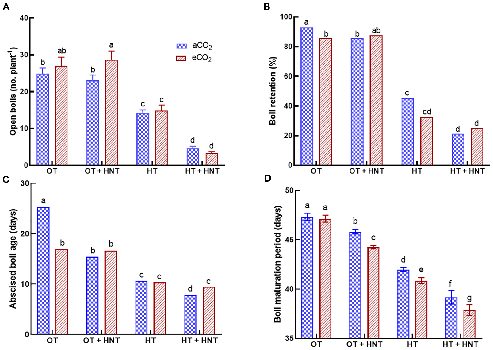 Day/Night air temperatures (OT: 33/21°C, OT+HNT: 33/24°C, HT: 36/24°C, HT+HNT: 36/28°C) and CO2 (aCO2: 425 ppm, eCO2: 725 ppm) effect on (A) number of open bolls, (B) boll retention (%), (C) abscised boll age (days), and (D) boll maturation period (days) on cotton. The bars are the treatment mean ± SE of 12 replications. The letter above the bar indicates statistical significance at p< 0.05. The treatments with the same letters are non-significant.