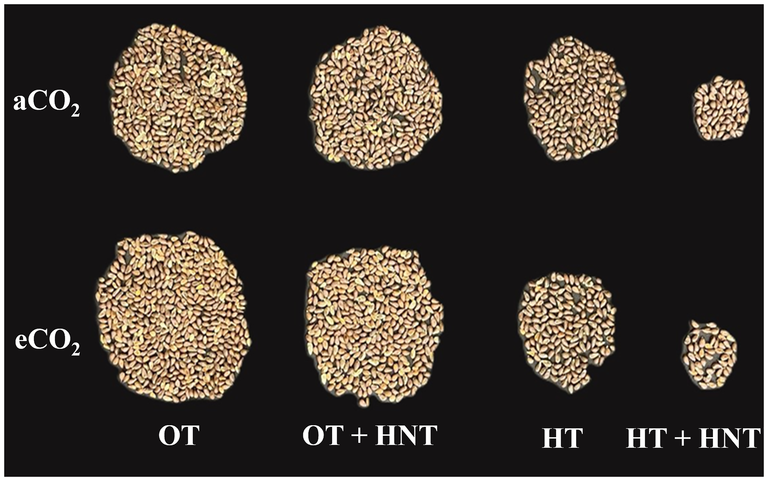 Seed yield under different Day/Night air temperatures (OT: 33/21°C, OT+HNT: 33/24°C, HT: 36/24°C, HT+HNT: 36/28°C) and CO2 (aCO2: 425 ppm, eCO2: 725 ppm) treatments in cotton. Image represents 50% yield of a plant.