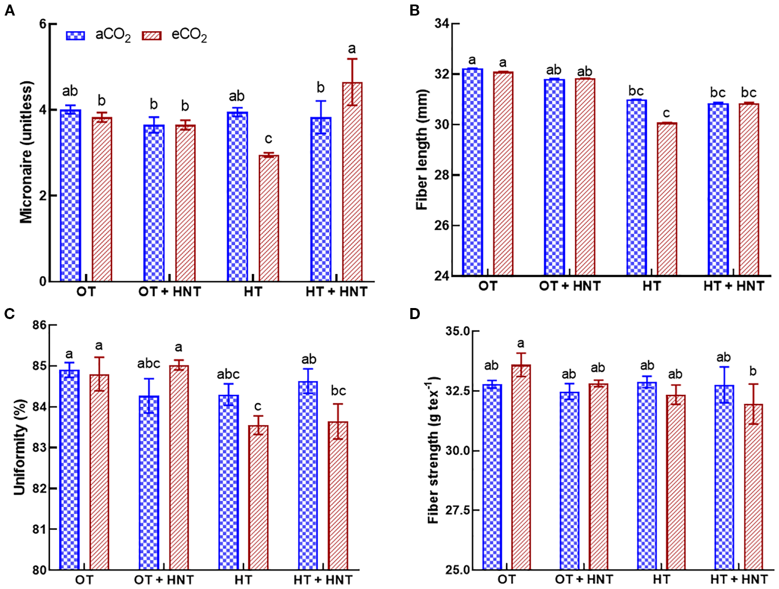 Day/Night air temperatures (OT: 33/21°C, OT+HNT: 33/24°C, HT: 36/24°C, HT+HNT: 36/28°C) and CO2 (aCO2: 425 ppm, eCO2: 725 ppm) effect on (A) micronaire, (B) fiber length, (C) uniformity, and (D) fiber strength of cotton lint. Bars represent the treatment mean ± SE of 3 replications. The letters above the bars indicate a statistically significant difference at p < 0.05. The treatments with the same letters are non-significant.