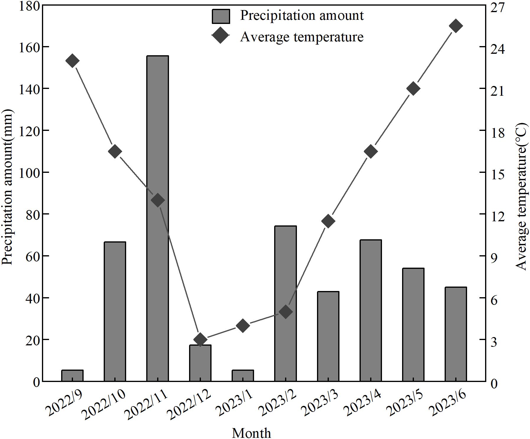 Bar and line graph illustrating monthly precipitation and average temperature from September 2022 to June 2023. Precipitation is highest in November 2022 at 160 mm, decreasing to under 20 mm by January 2023. Average temperatures are highest in June 2023 at 27°C, with a general upward trend from January 2023.