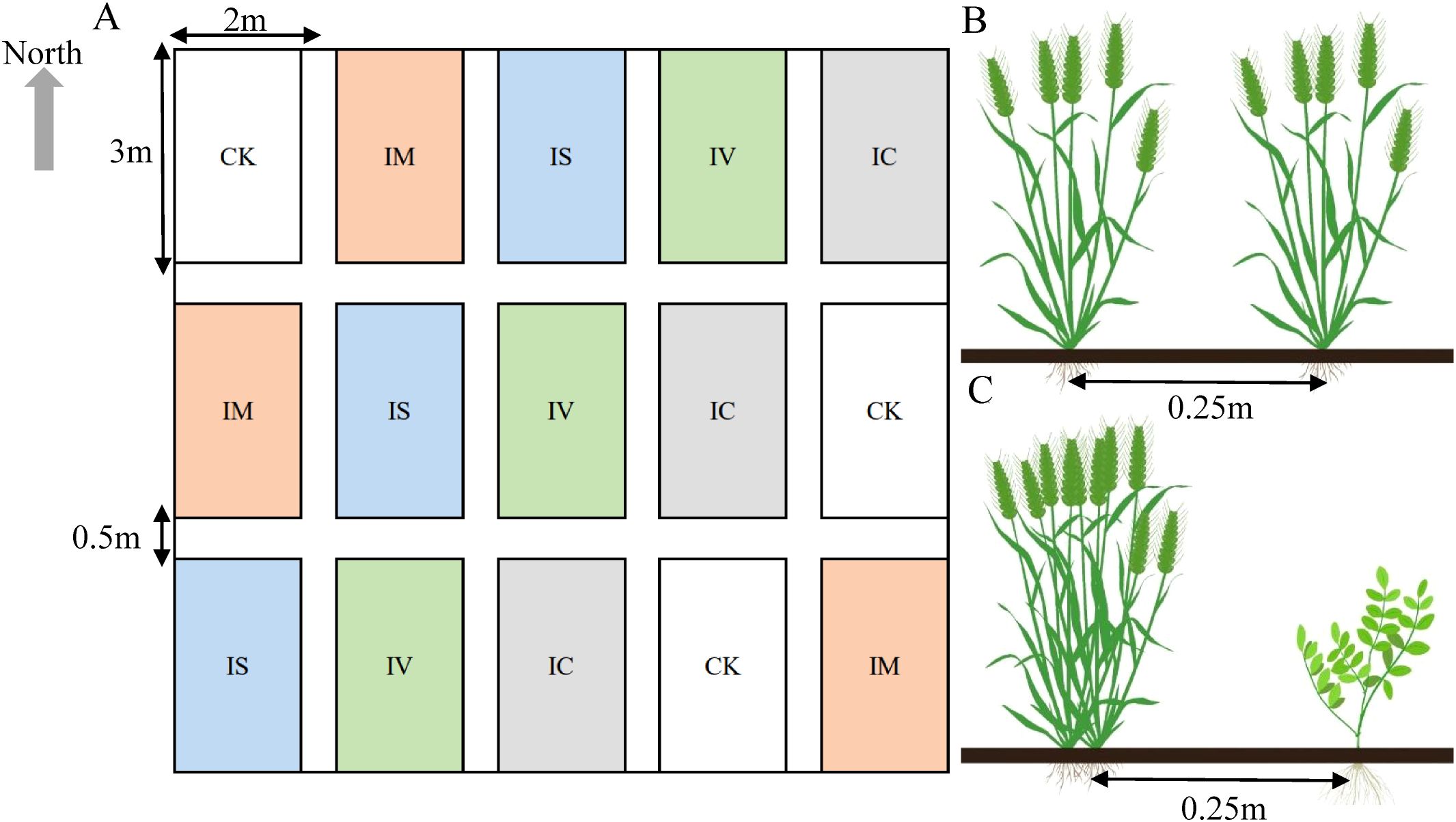 Figure 2. A random block design was adopted in the field trial, and the distribution of each cell is shown in (A). (B) shows the planting methods used for wheat in the monoculture wheat plot. (C) shows the planting of wheat in an intercropping legume green manure plot. CK stands for the wheat monocropping treatment, IM stands for the wheat intercropped with Chinese milk vetch treatment, IC stands for the wheat intercropped with clover treatment, IS stands for the wheat intercropped with smooth vetch treatment, and IV stands for the wheat intercropped with common vetch treatment.