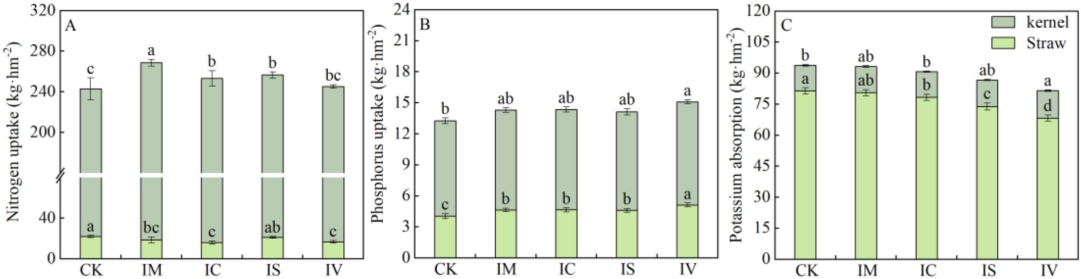 Three bar charts compare nutrient uptake in different treatments: CK, IM, IC, IS, and IV. Chart A shows nitrogen uptake, Chart B shows phosphorus uptake, and Chart C shows potassium absorption. Each chart is divided into kernel and straw contributions, indicated by different colors. Statistical letters above bars denote significant differences between treatments.