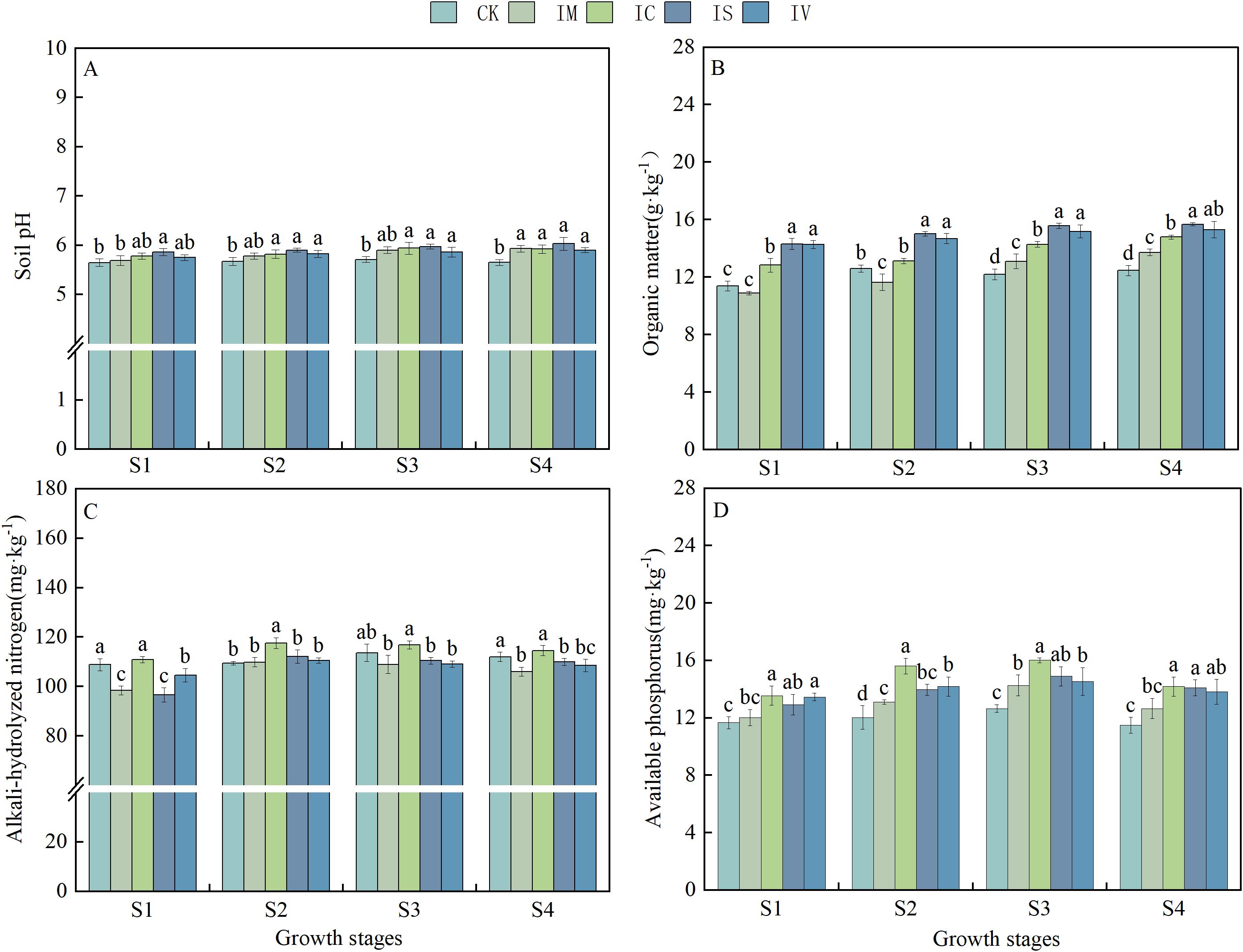 Four bar charts labeled A to D compare soil properties across four growth stages (S1 to S4) for five treatments: CK, IM, IC, IS, and IV. Chart A shows soil pH, chart B displays organic matter content, chart C illustrates alkali-hydrolyzed nitrogen levels, and chart D indicates available phosphorus content. Different letters indicate statistically significant differences among treatments. The colors light green, green, light blue, blue, and dark blue represent the treatments.