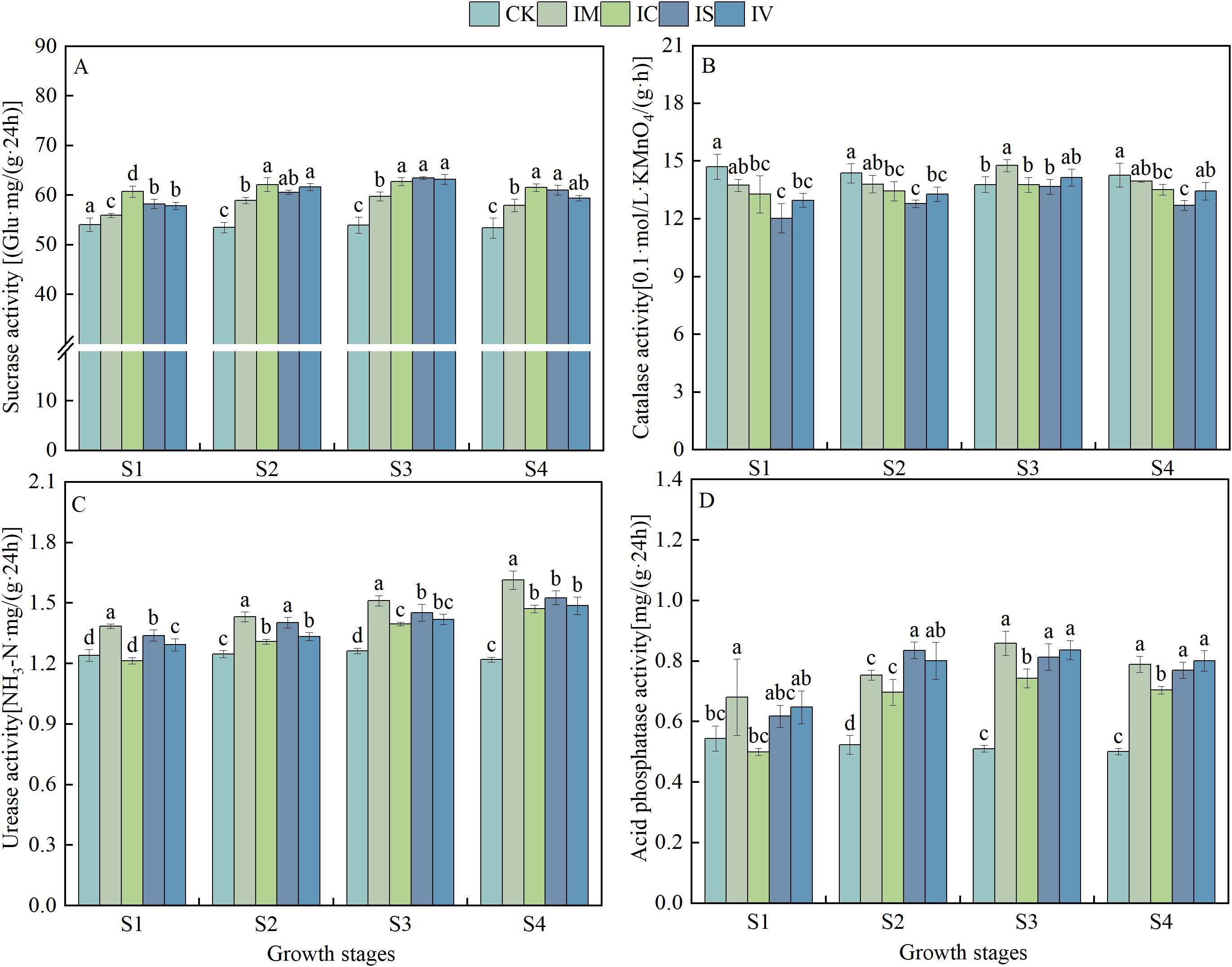Bar charts labeled A to D show enzyme activities over four growth stages (S1 to S4) for different treatments (CK, IM, IC, IS, IV). A: Sucrase activity increases slightly across stages. B: Catalase activity remains relatively stable. C: Urease activity shows moderate variation. D: Acid phosphatase activity is consistent with minor fluctuations. Variability is indicated by error bars, and significant differences are marked by letters.