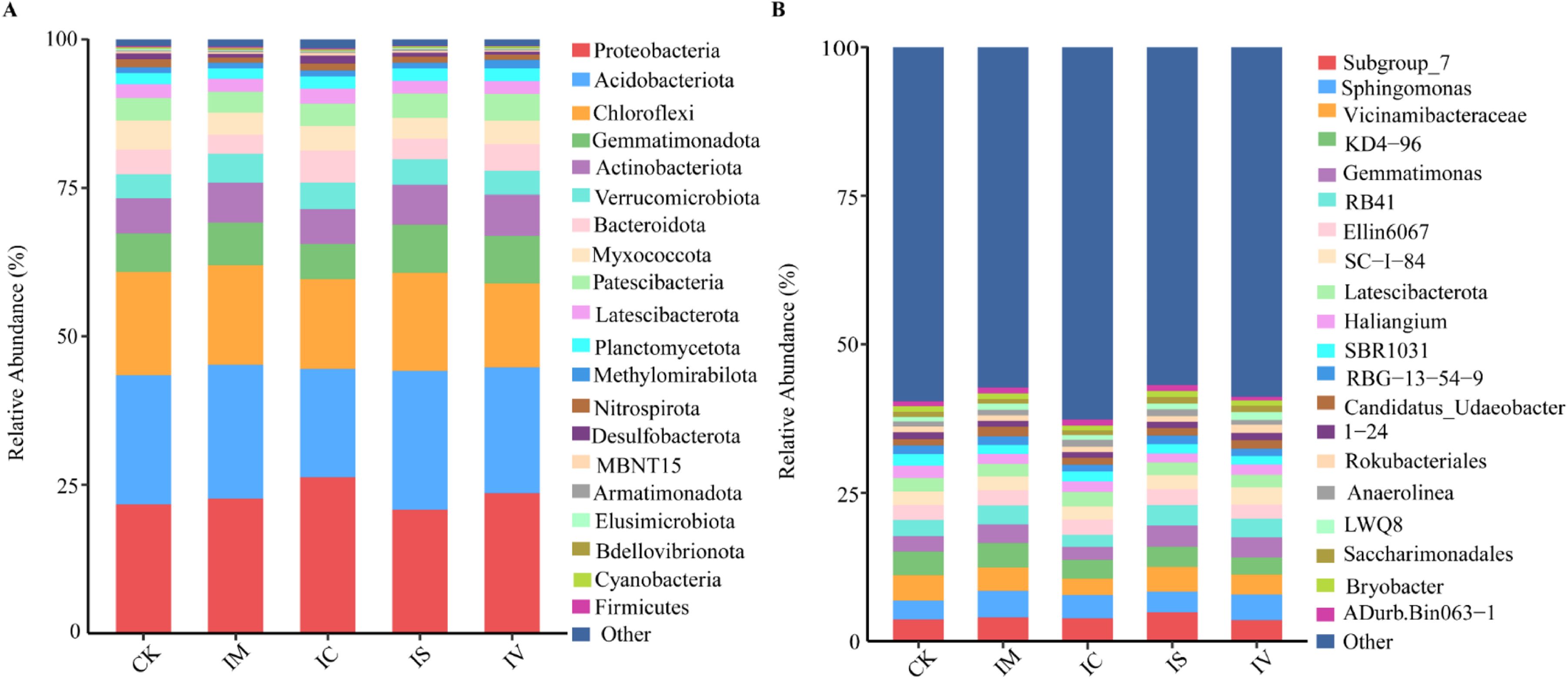 Bar charts labeled A and B show relative abundance percentages for different bacterial groups. Chart A highlights diverse bacteria like Proteobacteria and Acidobacteriota, while chart B focuses on Subgroup_7 and Sphingomonas. Both charts compare samples CK, IM, IC, IS, and IV.