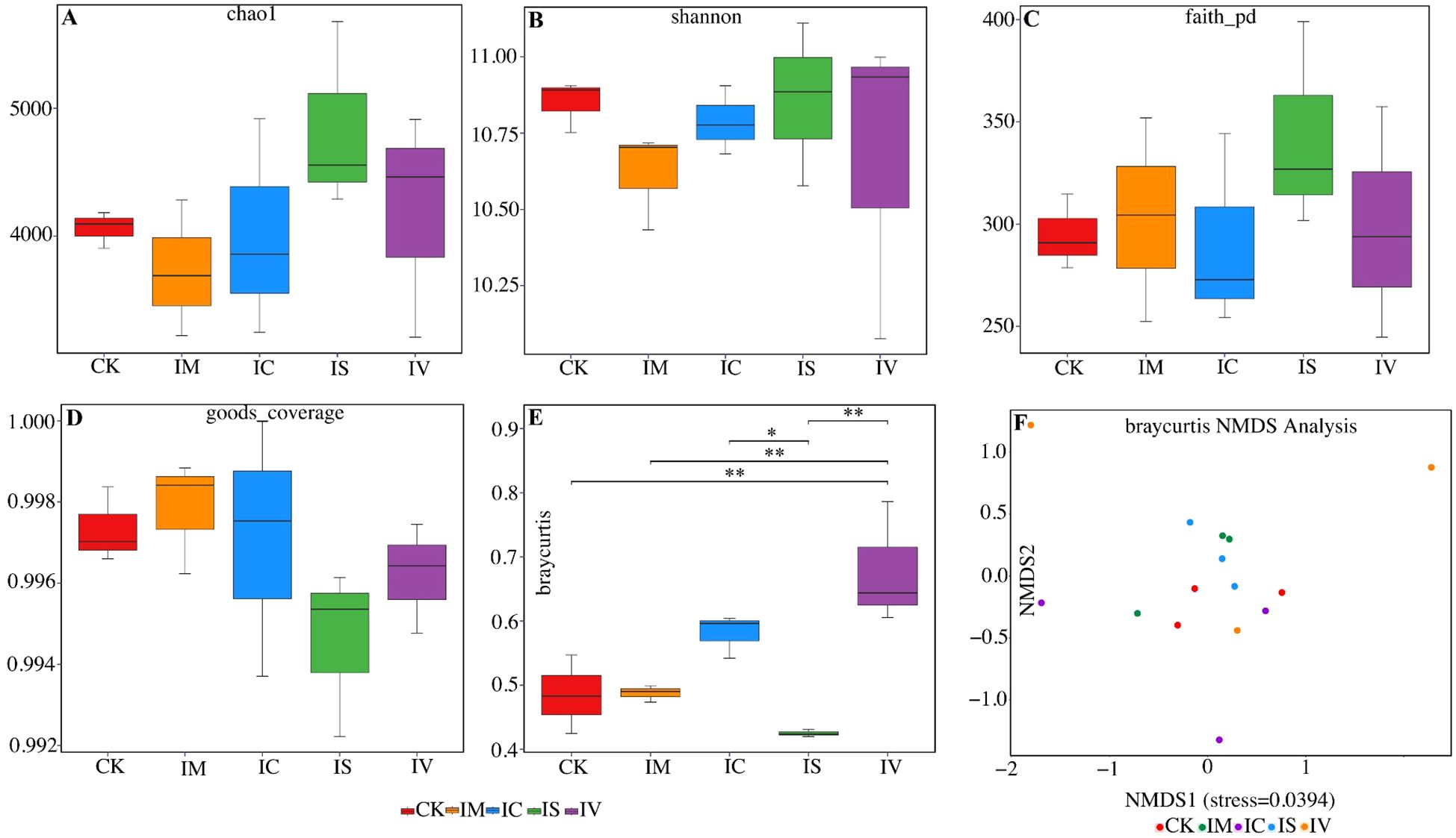Six-panel chart showing box plots (A-E) and a scatter plot (F). Panels A to D display Chao1, Shannon, Faith_pd, and Goods Coverage indices for groups CK, IM, IC, IS, and IV. Panel E shows Bray Curtis distances with significance marked by asterisks. Panel F is a Bray Curtis NMDS scatter plot, stress = 0.0394, illustrating group dispersion with colored dots corresponding to groups CK, IM, IC, IS, and IV.