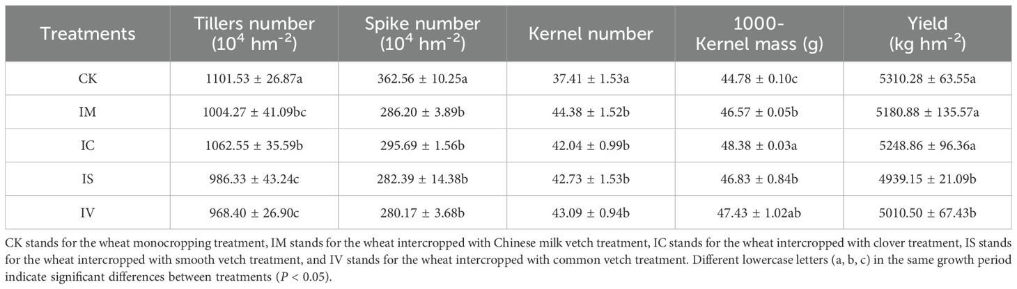 The effects of intercropping various legume green manures on wheat yield and agronomic traits are summarized in Table 1. There were no significant differences in wheat yield between the intercropping treatments (IM and IC) and monocropped wheat (P ≥ 0.05). However, yields in the control under the IS and IV treatments significantly decreased (P < 0.05), with reductions of 7.51% and 5.98%, respectively. Compared with those of monocropped wheat, the number of grains per spike and the weight of 1,000 grains significantly increased in the IM, IC, and IS treatments (P < 0.05). The IM treatment resulted in the greatest increase in the number of grains per spike, which increased by 18.63% compared with the CK. The largest increase in the 1000-grain weight was observed in the IC treatment, which was 8.04% higher than that of the CK. Conversely, these intercropping treatments resulted in a significant reduction in the number of tillers and panicles compared with those of the monocropped wheat (P < 0.05). Among the treatments, the IV treatment showed the most significant decrease in both the number of wheat stem nodules and the number of grains per spike, with a decrease of 13.75% in the former and 29.41% in the latter.