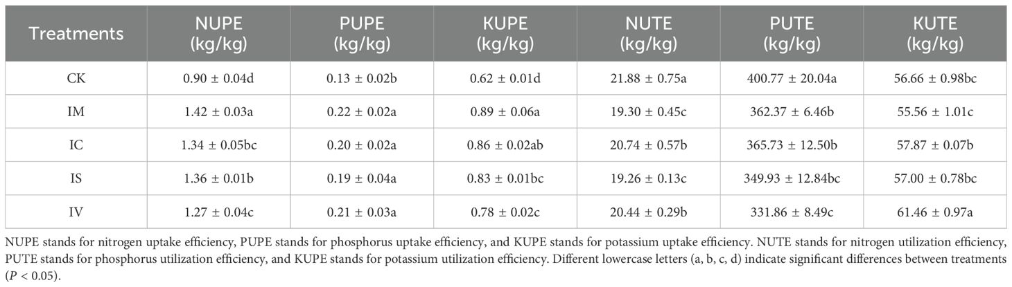 Table 2 presents the effects of intercropping various leguminous green manures on the absorption and utilization efficiency of nitrogen, phosphorus, and potassium in the aboveground parts of wheat. Compared with those of monoculture wheat, the absorption efficiencies of nitrogen, phosphorus, and potassium in the IM, IC, IS, and IV treatments were significantly greater (P < 0.05). The increases ranged from 41.11% to 57.78% for nitrogen, 46.15% to 69.23% for phosphorus, and 25.81% to 43.55% for potassium. However, the nitrogen and phosphorus utilization efficiencies in the IM, IC, IS, and IV treatments decreased relative to those in the CK (P < 0.05), with reductions of 5.50% to 13.60% for nitrogen and 9.58% to 20.76% for phosphorus. On the other hand, potassium utilization efficiency increased overall in all the treatments compared with that in the CK, with the IV treatment achieving the most significant improvement at 8.47%. Based on these results, intercropping with leguminous green manure crops enhances nitrogen and phosphorus absorption efficiency but reduces their utilization efficiency.