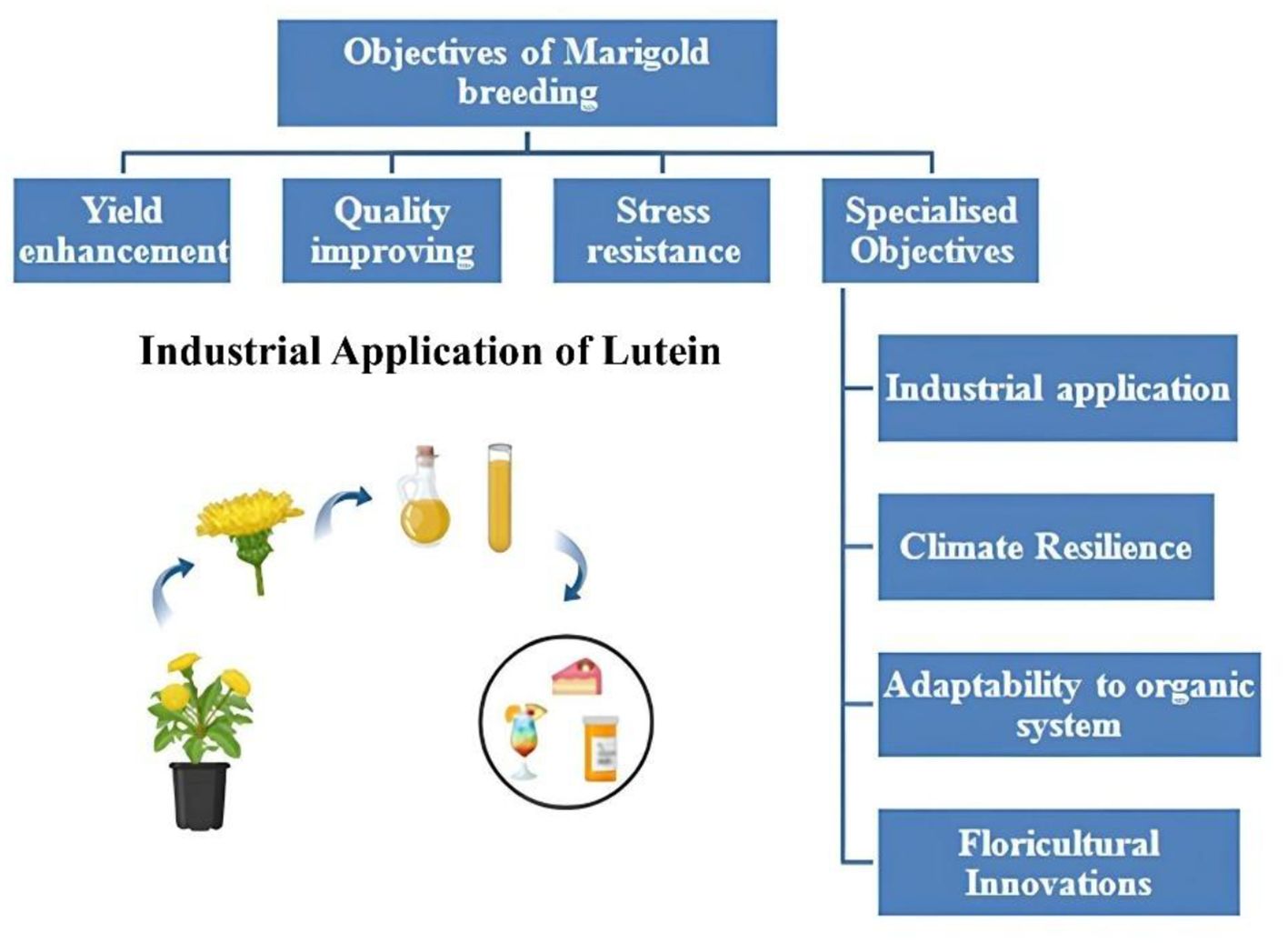 Breeding programs are targeting high carotenoid content for pigment extraction and medicinal properties. Varieties with enhanced lutein and zeaxanthin content are being developed to meet industrial demands (Buchori et al., 2024). As climate change introduces new challenges, breeding programs focus on developing varieties adapted to unpredictable weather conditions, such as unseasonal rainfall and extended dry periods (Cai et al., 2024). The demand for organic flowers has spurred breeding programs to develop varieties that thrive under organic cultivation with minimal chemical inputs (Zhang et al., 2022). Breeding for unique traits like double flowers, novel petal shapes, and bi-colored varieties is gaining traction to cater to high-value markets (Zhang et al., 2022).