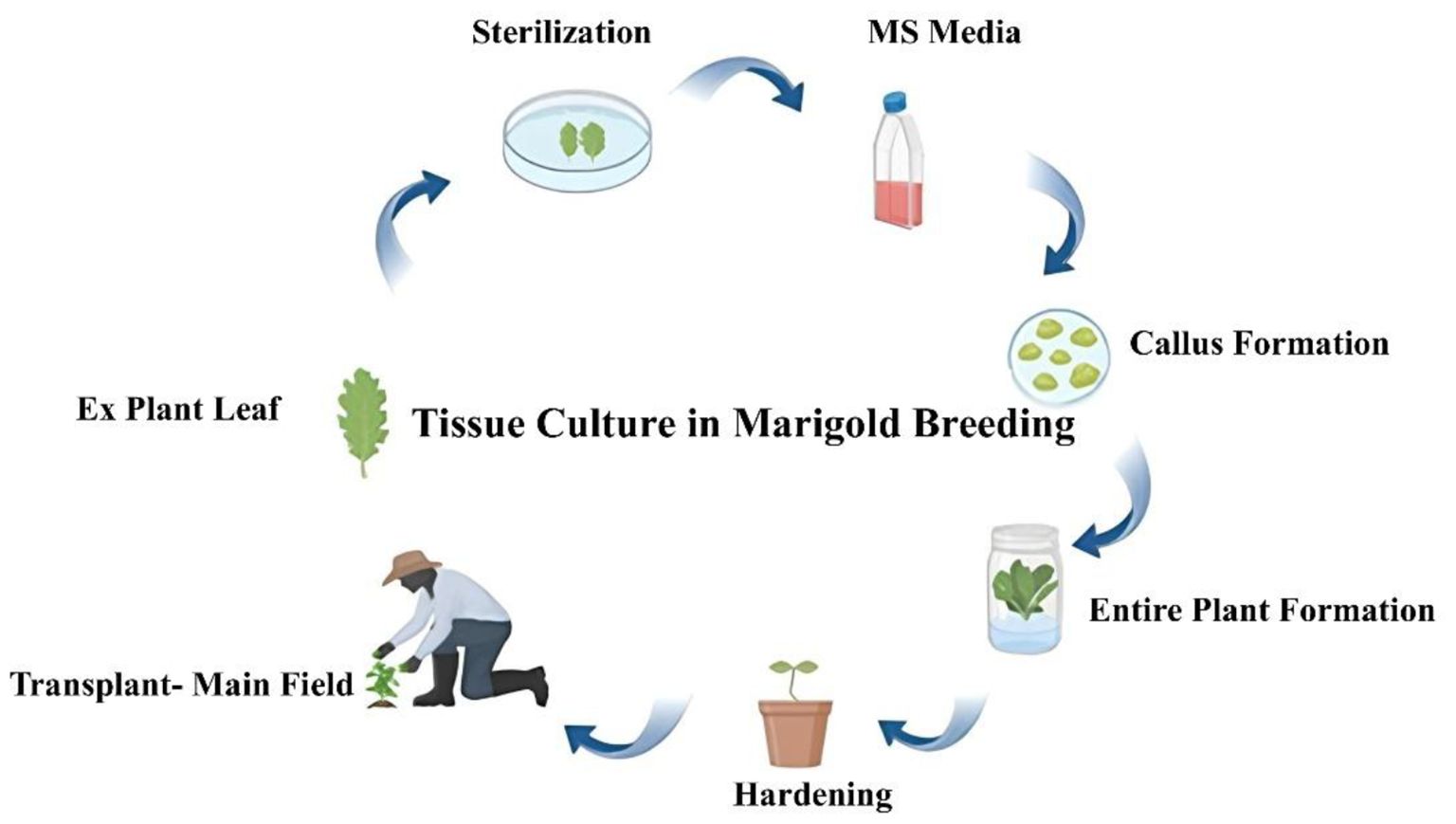 Tissue culture, specifically in vitro propagation, offers an efficient method for mass production of marigold plants. It bypasses the traditional seed propagation method, ensuring that desirable traits are consistently reproduced across generations. Recent advancements have allowed for the establishment of protocols for the regeneration of marigold from different explants such as shoot tips, leaf pieces, and flower tissues. Tissue culture and micropropagation techniques have important tools in modern marigold breeding programs. These methods offer rapid and efficient means for propagating elite genotypes, preserving genetic diversity, and enhancing breeding strategies (Kumar et al., 2018). Micropropagation has been employed extensively for the clonally multiplication of elite marigold genotypes with desired characteristics. This method allows breeders to obtain genetically uniform plants quickly and in large numbers. A key advantage of in vitro propagation is its ability to overcome the limitations of seed propagation, such as seed dormancy and low germination rates, which are sometimes seen in marigold cultivars. For instance, the use of cytokinin-based media has been shown to enhance shoot multiplication in marigold cultivars, leading to a rapid increase in plant numbers (Fibriani et al., 2023). The outline of tissue culture in marigold is shown in Figure 2.
