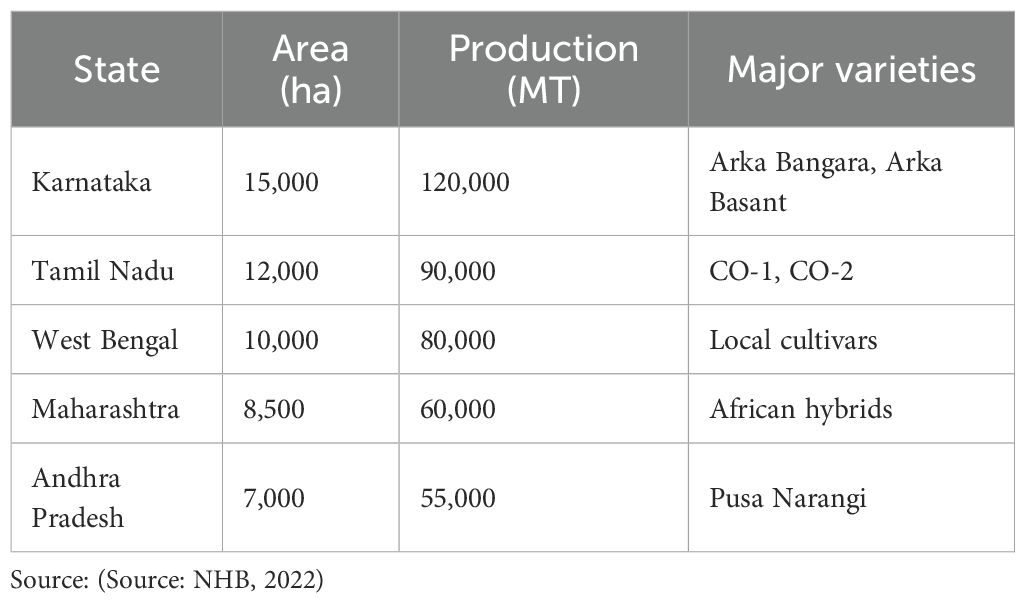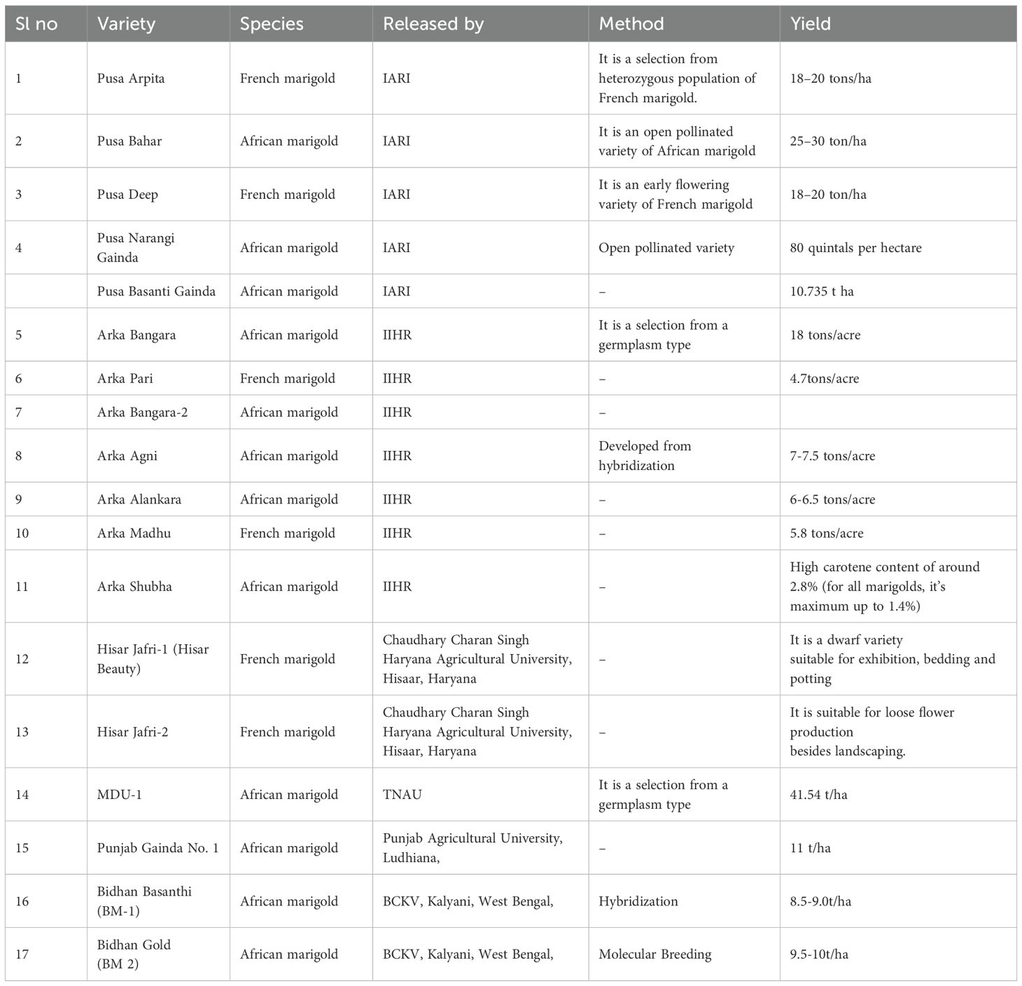 In India, marigold (Tagetes spp.) is an attractive crop with significant cultural, economic, and industrial value. Valued for their vibrant flowers, marigolds hold a major role in religious and social ceremonies, as well as in landscaping. Marigold is native to South and Central America especially Mexico and belong to the family Asteraceae (Compositae) (Shafiee et al., 2023). The genus Tagetes commonly cultivated species are Tagetes erecta (African Marigold), Tagetes patula (French Marigold) and Tagetes minuta. Marigold are long upright and quick growing habit (Udchachon et al., 2021). The height of plants ranges from 30 to 90 cm (Yadav and Dahiya, 2020). The flowers of these varieties are deep orange, light orange, golden yellow, bright yellow and lemon yellow in color. The size of flower may vary from 4 to 6cm in diameter. Marigold is good source of carotenoid pigment for poultry feed to intensify yellow color of egg yolks (Zhang et al., 2020). The crop is a critical raw material for the extraction of carotenoids, particularly lutein and zeaxanthin, which are widely used in the dye, food, and pharmaceutical industries (Shafique et al., 2021). India is the leading producers of marigold, with major cultivation areas in Karnataka, Tamil Nadu, and Maharashtra contributing significantly to domestic and export markets. Marigold cultivation is successful because it can adapt to a variety of agroclimatic conditions and yield large quantities of flowers quickly (Kumar et al., 2020). The crop is grown both as a field crop and in protected environments, supporting livelihoods across various regions. Improved varieties and hybrids such as ‘Arka Bangara,’ ‘Arka Agni,’ and ‘Pusa Narangi Gainda’ have enhanced marigold production, meeting the growing demands for high-quality flowers (Kaushal et al., 2024). Marigold also finds industrial application like preparation of natural dyes and essential oils. It is used as mosquito and nematode repellents. The marigold plants are highly useful for suppressing the population of nematodes in the field. The uses of marigold are extensive, often referred to as, “Versatile crop with golden harvest”. Marigolds produce thiopenes, which are toxic to nematodes and used as trap crop in tomato, brinjal, tobacco etc. Despite its adaptability, marigold cultivation faces challenges such as the limited availability of high-performing hybrids and susceptibility to pests like aphids and diseases such as alternaria blight and powdery mildew (Dedhia, 2024). Climate-induced stress factors, including drought and salinity, significantly impact flower yield and quality, further emphasizing the need for stress-resilient varieties (Akhtar et al., 2022). Efforts to enhance marigold cultivation have shifted from traditional breeding approaches to incorporating molecular tools, including marker-assisted selection (MAS) and genome editing, to develop superior varieties. This integration of traditional and modern techniques is essential to overcoming current challenges and unlocking the crop’s full potential for sustainable production (Susrama and Yuliadhi, 2020). The state-wise Marigold production in India for 2022–23 is presented in Table 1.