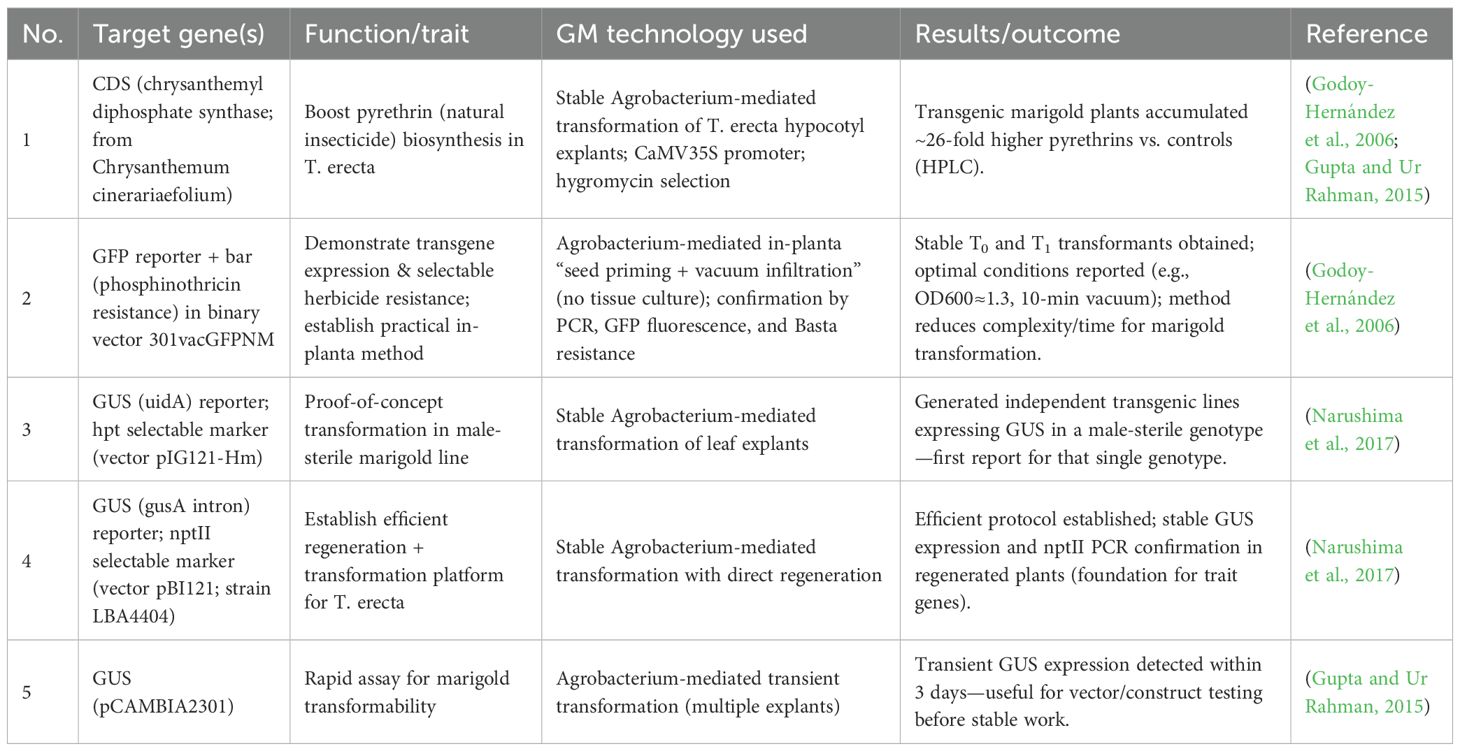 Table 3. Key genes and GM technologies used for improvement of flower color in marigold (Tagetes erecta).