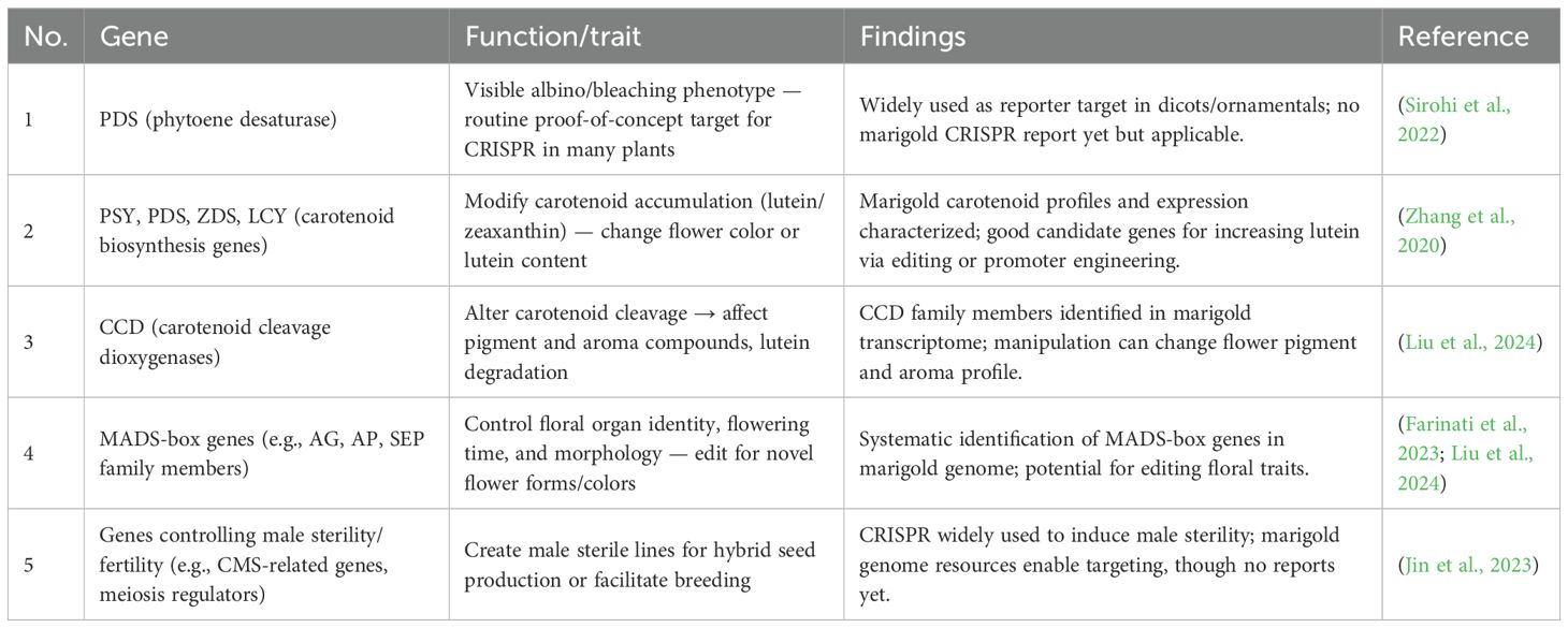 The CRISPR-Cas9 system, a groundbreaking genome editing tool, has transformed plant breeding by enabling precise and targeted modifications of the plant genome. This approach allows for the incorporation of desirable traits without relying on traditional crossbreeding methods. The CRISPR-Cas technology presents significant potential for addressing challenges such as pest resistance, flower quality, and stress tolerance. Successful applications of CRISPR-Cas9 in ornamental plants, including modifications to flower color in Petunia hybrida, demonstrate its versatility (Nishihara et al., 2024). Recent studies have highlighted CRISPR-Cas9ability to enhance consumer-preferred traits in various crops (Verma et al., 2023), indicating that similar strategies could be explored in marigold to modify anthocyanin biosynthesis pathways and develop novel flower colors. Enhancing stress tolerance in marigold is another promising avenue for CRISPR-Cas9 technology. Introducing genes responsible for resistance to abiotic stresses such as drought and salinity could significantly improve the adaptability to harsh growing conditions. Research on other crops has demonstrated that CRISPR-mediated gene editing can strengthen responses to abiotic stress (Yadav et al., 2023), suggesting that similar methods could be applied to marigold for genetic improvement. Silencing genes linked to undesirable traits, such as short flower shelf life or reduced vase longevity, is another potential application of CRISPR. Targeting ethylene biosynthesis or signaling pathways, which are crucial to flower senescence, has been shown to extend vase life in ornamental plants (Xu et al., 2020). Implementing these techniques in marigold could enhance its commercial appeal by increasing flower longevity. Regulatory challenges currently limit the widespread adoption of CRISPR-Cas in India, but as the technology becomes more accessible and widely accepted, its potential for precision breeding in marigold will increase. Future research will aim to refine CRISPR-Cas9 protocols, minimize off-target effects, and navigate regulatory and ethical considerations (Dhanavel, 2022). The Potential Candidate Genes for CRISPR/Cas-Mediated Genome Editing in Marigold is tabulated in Table 4.