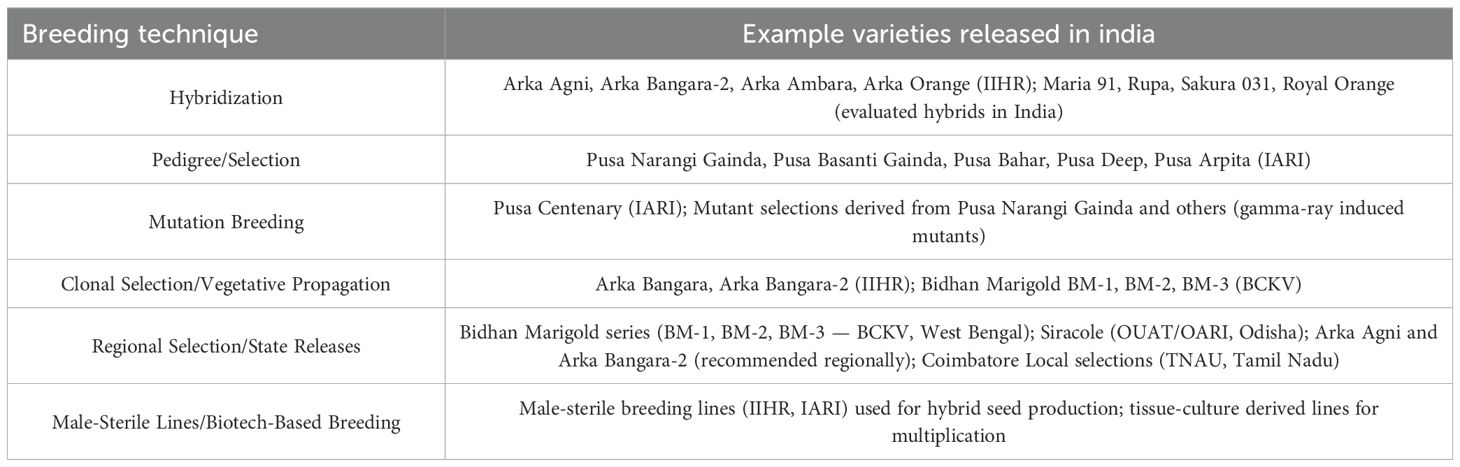 Marigold breeding in India has achieved significant milestones over the years, especially in areas such as yield enhancement, quality improvement, and stress tolerance. The integration of both conventional and modern breeding techniques has led to the development of marigold cultivars that meet the increasing demands of the ornamental and pharmaceutical industries (Tang et al., 2020). One of the main goals of Indian breeding initiatives has been to create marigold cultivars with high yields. As the demand for marigold flowers continues to rise, particularly for use in religious ceremonies, decorations, and the extraction of carotenoids for industrial purposes, there is a growing need for varieties that offer high production efficiency and consistent yield (Youssef et al., 2020). One of the notable achievements in this area is the release of hybrid varieties such as ‘Arka Bangara,’ ‘Arka Bangara-2,’ and ‘Arka Agni,’ which have demonstrated significantly higher flower yields compared to traditional cultivars. It is reported that these hybrids have been specifically bred to enhance flower size, flower count per plant, and overall yield per hectare, contributing to greater productivity in marigold cultivation (Kumar et al., 2019; Panda et al., 2022). Furthermore, these varieties are known for their improved disease resistance, which has enhanced their adaptability in various climatic conditions across India. Breeding for high yield involves the selection of plants with desirable traits, such as larger flowers and increased branching (Kumar et al., 2019). Recent advancements in hybridization techniques have enabled the development of marigold cultivars that not only exhibit higher yields but also have enhanced shelf life, making them more commercially viable. It is highlighted the potential of hybrid vigor in marigold, where F1 hybrids display superior growth performance and resistance to biotic stresses (Modi et al., 2009). These hybrids have been widely adopted in marigold production, especially in states like Karnataka, Maharashtra, and Tamil Nadu, where marigold farming is economically significant. Different breeding techniques and Marigold varieties released in India are tabulated in Table 1 and Table 5. Different conventional breeding techniques followed in Marigold is shown in Figure 3.