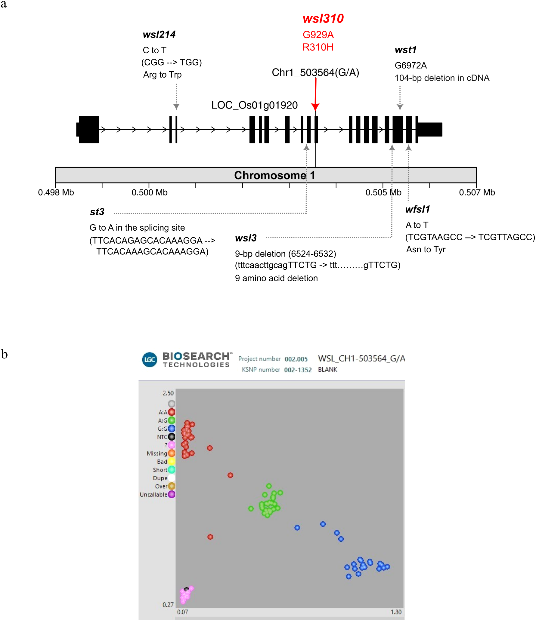 A missense-variant (CGT/CAT) of LOC_Os01g01920 on chromosome 1 at the 929-nucleotide sequence on exon 10 was identified as the functional SNP for wsl. A functional marker was developed based on KASP (Kompetitive Allele Specific PCR).