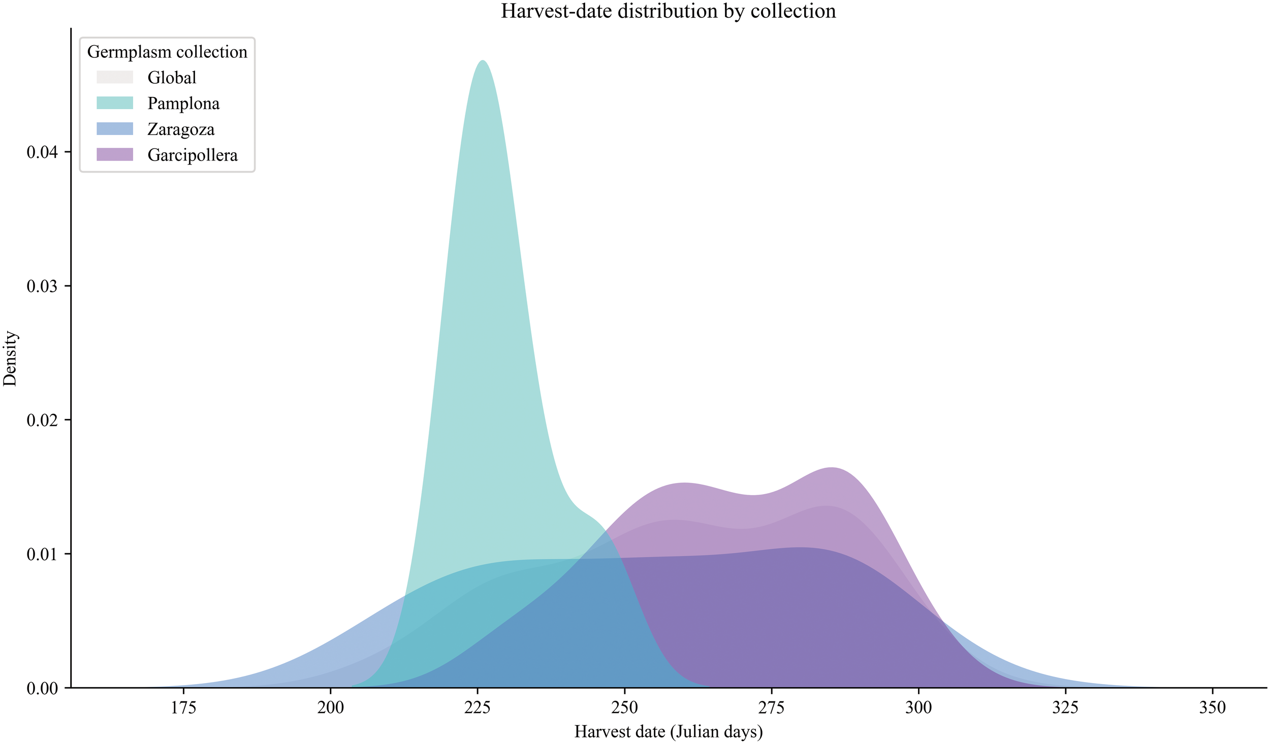 Harvest-date distribution by collection. Distribution of harvest date expressed as Julian days among the different germplasm collections during harvest seasons 2020 and 2021. A global trend is shown in grey, UPNA collection corresponds to Pamplona (in cyan), CITA collections corresponds to Zaragoza (in dark blue) and Bescos de la Garcipollera (in purple).
