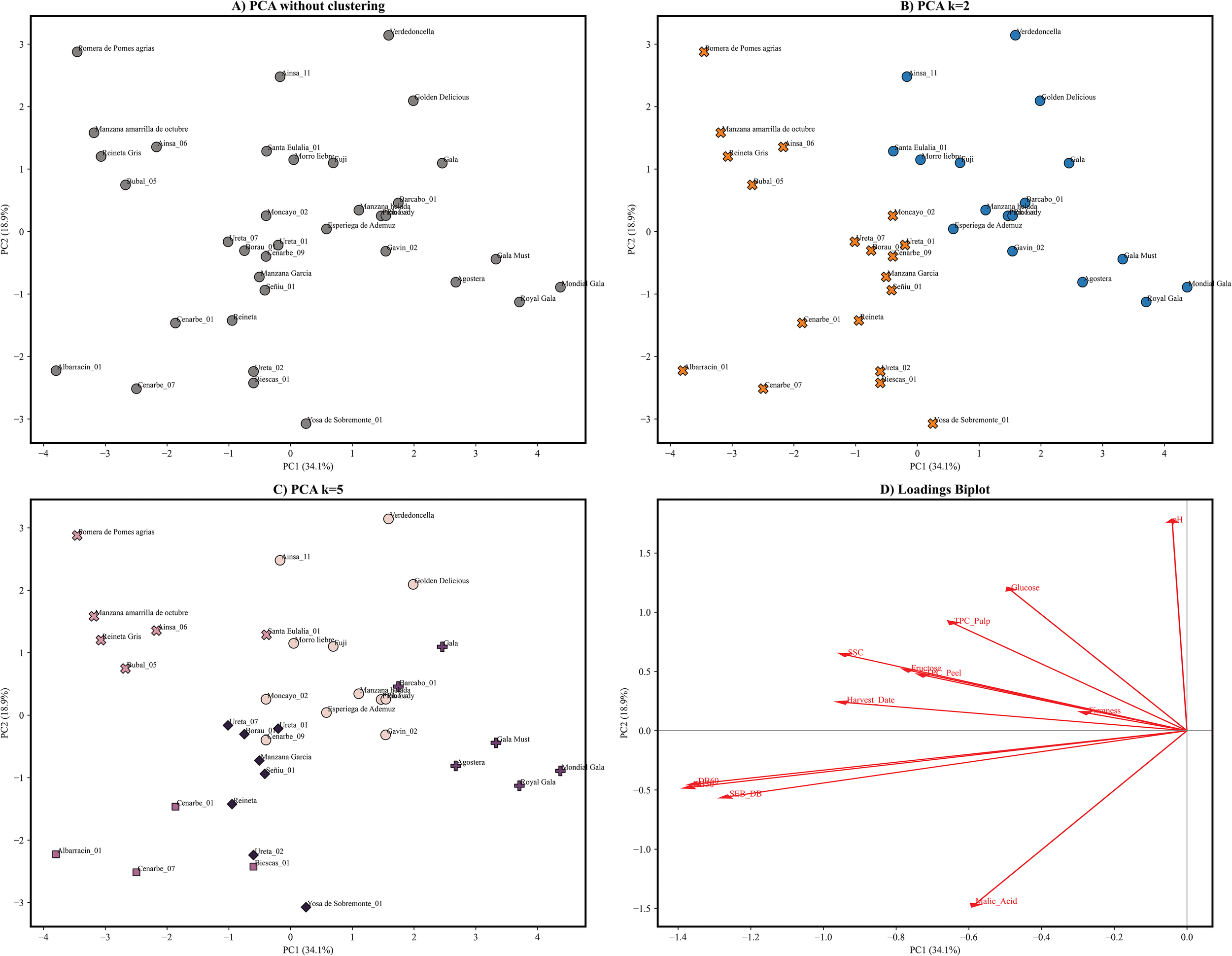 (A) PCA results based on the measurement of 12 physicochemical and biochemical traits in 36 apple genotypes collected during 2020-2021. PC1 explained 34.1% of the variance whereas PC2 explained 18.9% of the variance. (B) PCA with coloured membership of obtained groups after clustering using k means for k=2, groups 1 and 2 are marked orange and blue. (C) PCA with coloured membership of obtained groups after clustering using kmeans for k=5, groups 1,2,3,4 and 5 are coloured in lightpink, pink, light purple, purple and black. (D) Biplot of PCA loadings in first and second principal components, a longer arrow represents a higher loading (interaction) in principal component towards the arrow is pointing. Lowest interaction is shown by firmness, whereas high interactions are shown by oxidation indexes ΔBI.