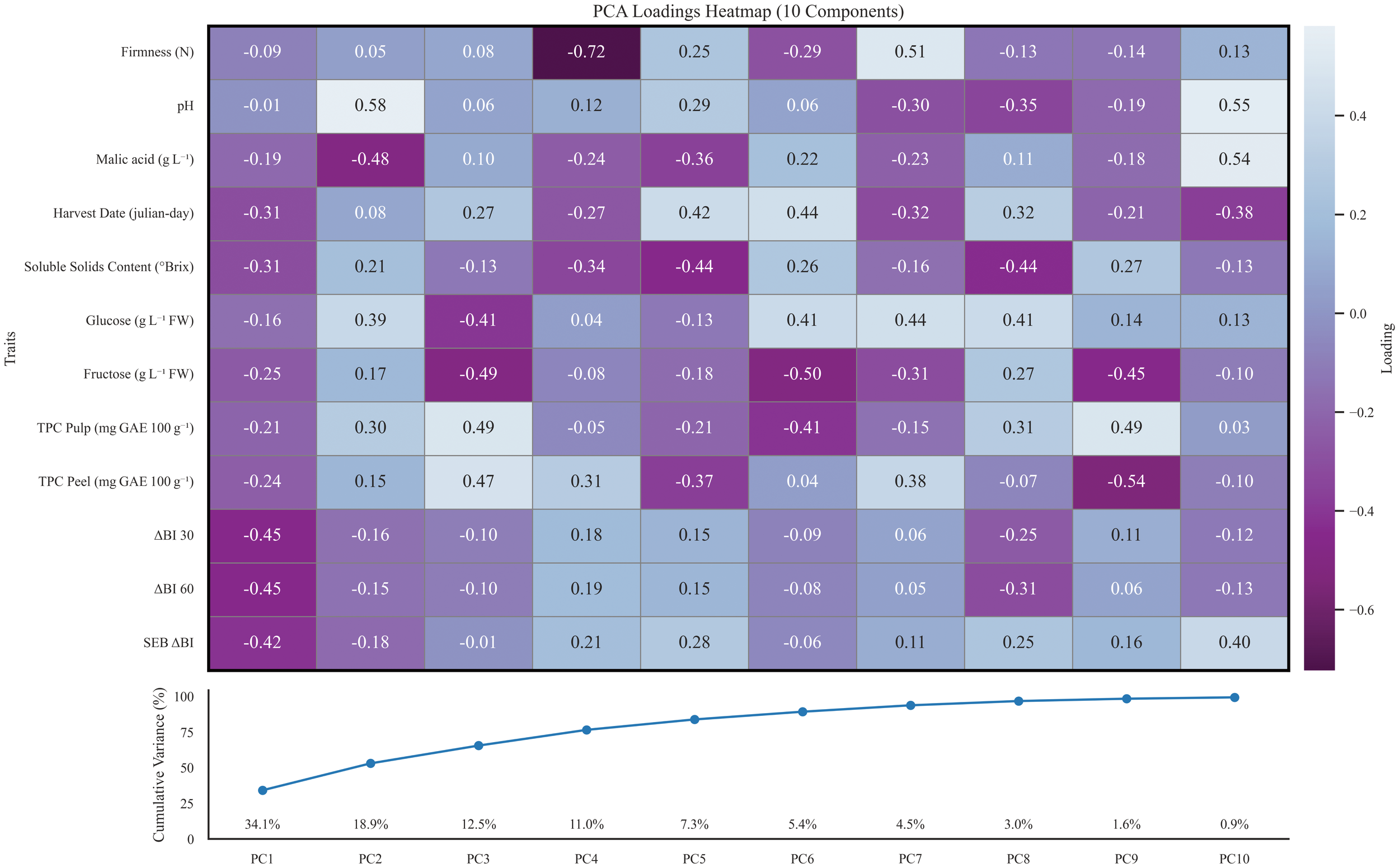 Top: PCA loadings heatmap of all studied traits for 10 first principal components. Positive loadings are coloured blue, whereas negative loadings are coloured purple. Principal components are shown in order from first column to tenth. Bottom: Accumulated explained variance by individual principal components of the PCA. Each component’s explained variance is plotted in the x axis whereas the dot line shows the accumulated variance for the sum of previous principal components.