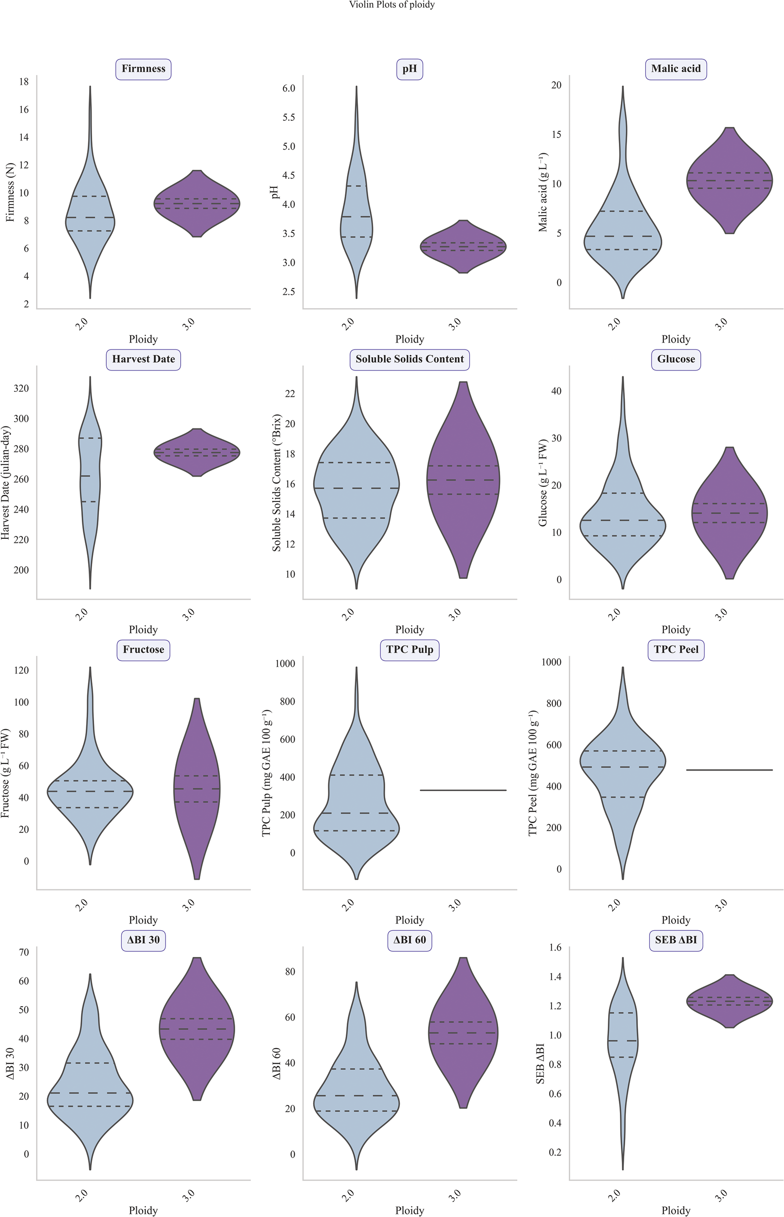 Violin plots of 12 phenotypic traits for 36 apple genetic groups across ploidy levels for the 2020–2021 growing seasons. From top to bottom and left to right studied traits were firmness (N), pH, malic acid (g/L), harvest date (Julian days), soluble solids content (°Brix), glucose (g/L), fructose (g/L), total phenolic content (TPC) in pulp (mg GAE/100 g FW), TPC in peel (mg GAE/100 g FW), ΔBI 30, ΔBI 60 and SEB ΔBI. Values from diploid accessions are shown in blue whereas values from triploid accessions are in purple.